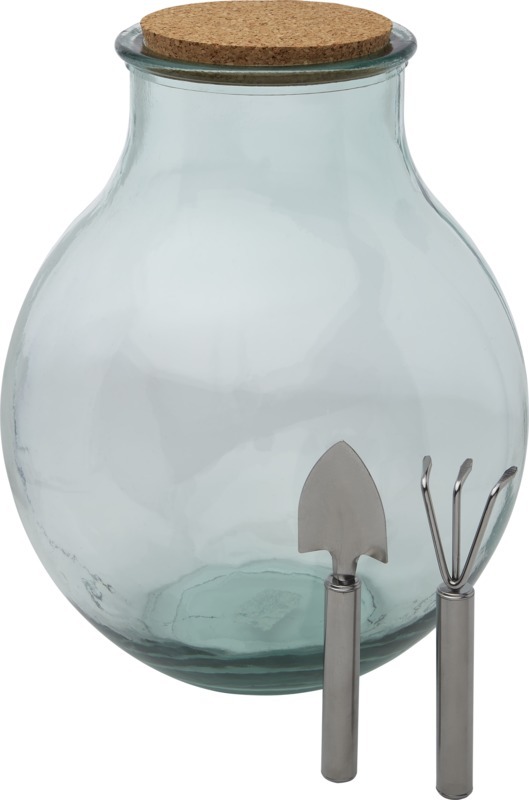 Стеклянный террариум из 100% переработанного стекла с садовыми инструментами из пробки и нержавеющей стали. Террариум похож на аквариум, но предназначен для растений, а не рыб. С помощью него вы можете создать свой собственный миниатюрный сад или лес, заключенный в собственном маленьком мире. Террариум изготовлен из переработанных стеклянных бутылок. На изготовление переработанного стекла затрачивается меньше энергии, сырья и добавок, чем на изготовление традиционного стекла. Переработанное стекло, Cork, нержавеющая сталь.