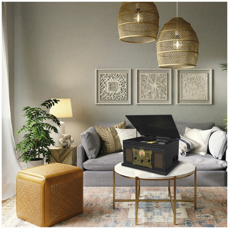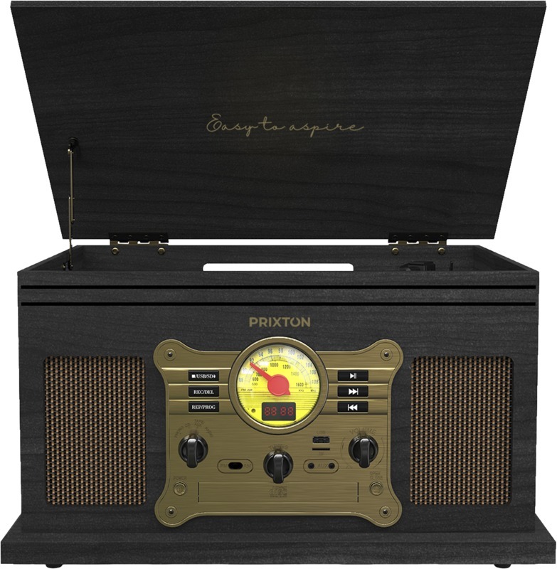 Проигрыватель, который воспроизводит виниловые пластинки и преобразует звук в цифровой формат через USB и SD-карту. Он также воспроизводит музыку через Bluetooth®, USB, SD-карту, радио, CD и кассеты. Проигрыватель имеет 2 стереодинамика мощностью 3 Вт каждый и 2 аудиовыхода (разъем 3,5 мм/RCA). В комплект поставки входит адаптер 45 об/мин для установки виниловых пластинок различных размеров. Пластик.