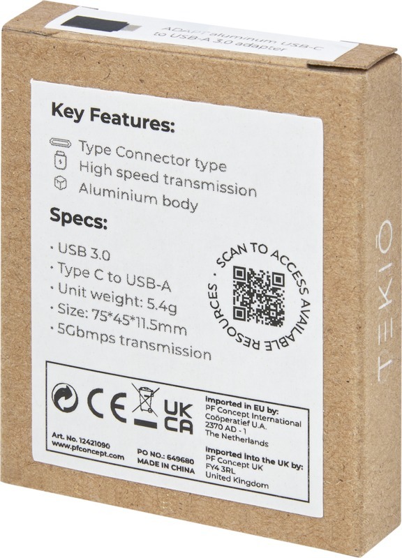 Адаптер USB-C на USB-A 3.0 изготовлен из алюминия. Совместима с USB 3.1 поколения 1 и обеспечивает передачу данных до 5 ГБ/с, а также совместима с более низкими версиями. В 10 раз быстрее USB 2.0 при обработке данных. Максимальная мощность зарядки 900 мА на порт и максимум 3 А зарядки на всех портах USB-A. Поставляется в коробке из крафт-бумаги премиум-класса и красочной наклейкой. Алюминий, Пластик ABS.