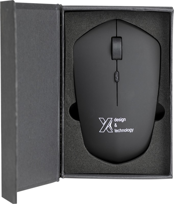 Беспроводная оптическая мышь с подсвечиваемым логотипом. Логотип светится ярко при полной зарядке и тускнеет, когда остается 20% заряда аккумулятора. Входная/выходная мощность USB: 5 В — 0,035 A. Емкость: 400 мАч. DPI: 800/1200/1600. Время зарядки: 3 часа. В комплект входит USB-кабель длиной 1 метр. Поставляется в подарочной коробке из переработанной бумаги с магнитной застежкой. Пластик ABS, Резина.