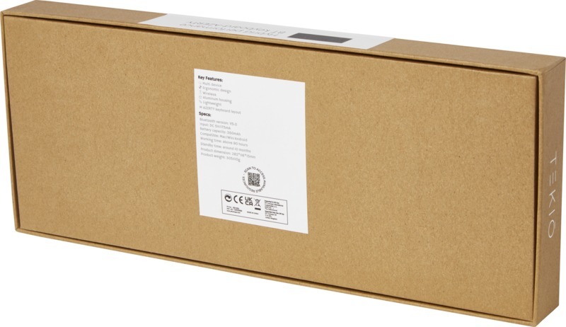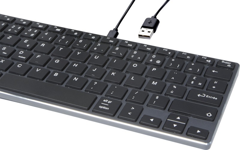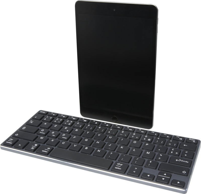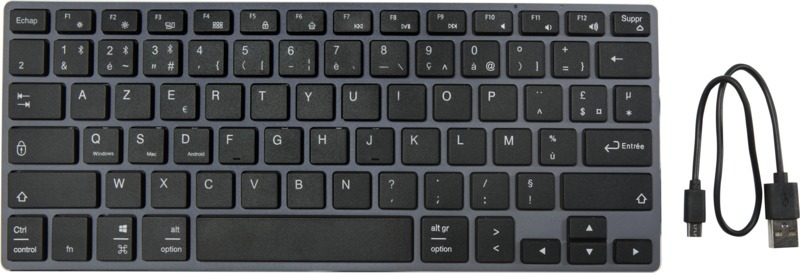 Легкая, но прочная и стильная клавиатура (раскладка AZERTY, 78 клавиш) с алюминиевым корпусом. Клавиатура поддерживает Bluetooth® 4.0 для стабильного соединения и низкого энергопотребления и совместима с ПК/ноутбуком, планшетами, мобильными телефонами, смарт-телевизорами и другими устройствами с функцией Bluetooth®. Радиус действия составляет до 10 метров, также клавиатура имеет встроенную перезаряжаемую батарею емкостью 350 мАч. Поставляется в премиальной коробке из крафт-бумаги с красочной наклейкой. Алюминий, Пластик ABS.