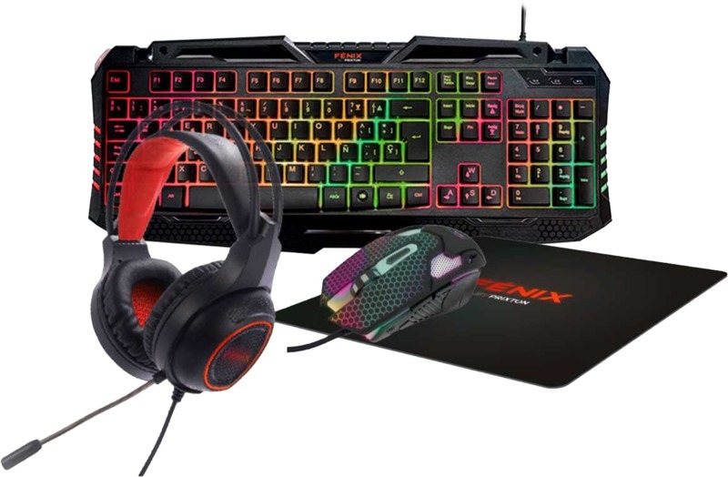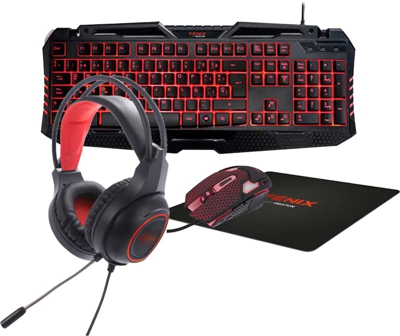 Игровой набор с клавиатурой, мышью, гарнитурой и ковриком для мыши. Клавиатура с раскладкой QWERTY имеет 105 клавиш и 3 встроенных подсветки. На мыши имеется 6 кнопок и 7 цветов с разрешением 800/1200/1600/2400 точек/дюйм. Гарнитура с красной светодиодной подсветкой и динамиком размером 40 мм, адаптером для подключения к ПК, PS4 и XBOX. 50% Пластик, 50% Металл.