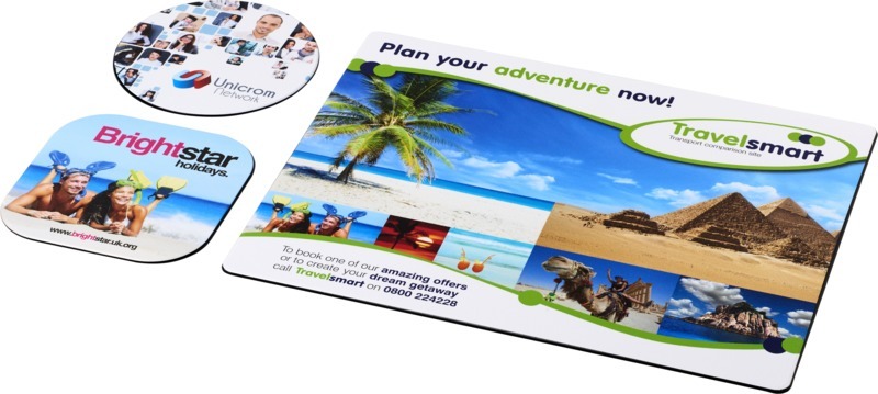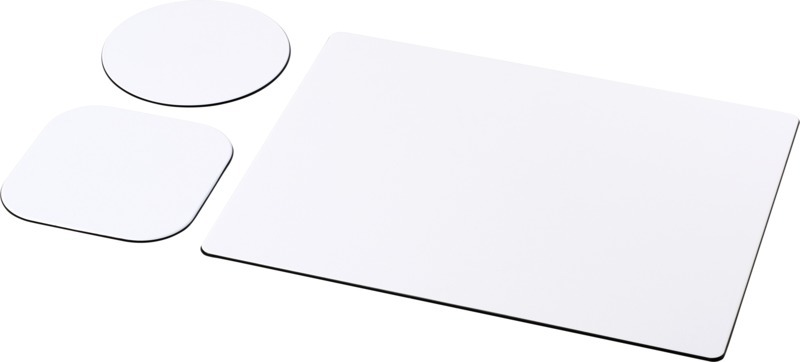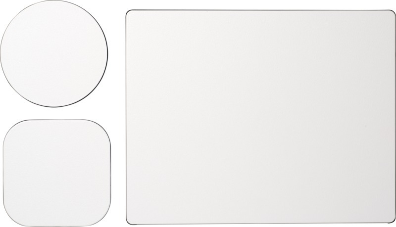 Поставляется с ковриком для мыши Brite-Mat и набором соответствующих подставок. Набор состоит из прямоугольного коврика для мыши (0,3 x 19 x 21 см), квадратной подставки (0,3 х 9,5 х 9,5 см) и круглой подставки (0,3 x ø9,5 см). Ламинированная бумага, Переработанная бумага. FSC Mix Credit P8 CU-COC-877277.