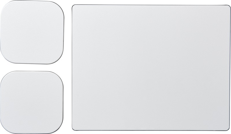 Поставляется с ковриком для мыши Brite-Mat и набором соответствующих подставок. Набор состоит из прямоугольного коврика для мыши (0,3 x 19 x 24 см) и двух квадратных подставок (0,3 х 9,5 х 9,5 см). Recycled Plastic, Ламинированная бумага, Black masterbatch. FSC Mix Credit P8 CU-COC-877277.