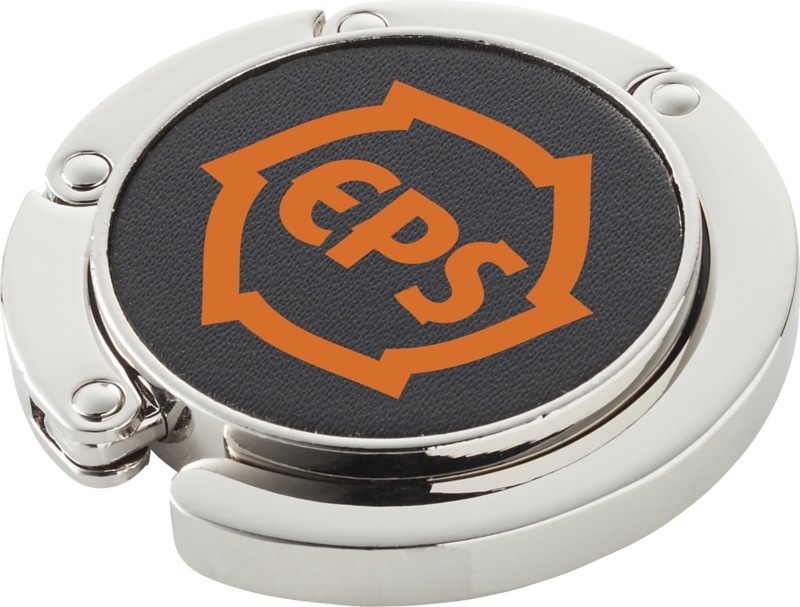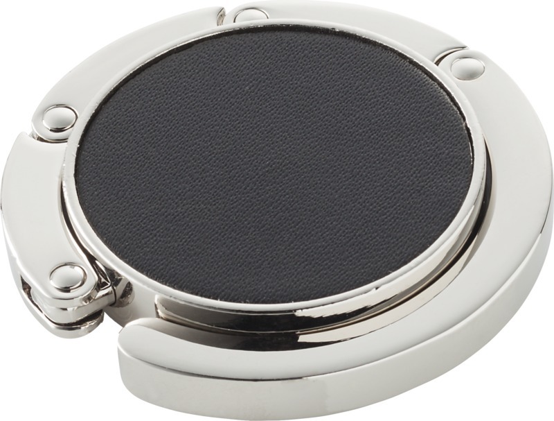 Складная вешалка для сумки, которая помогает уберечь сумку от загрязнения. Вешалку можно прикрепить на край поверхности; она выдерживает до 4,5 кг. Цинковый сплав.