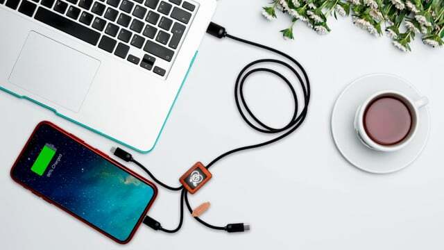 Кабель 3-в-1 в оплетке из бамбука с проводами длиной 1 м и 3 разъемами (тип C, микро USB, iPhone). Возможно добавление логотипа с подсветкой с обеих сторон. Поставляется в сумке TPU с картой из крафт-бумаги. . Переработанный PET пластик, Переработанный ABS пластик, Бамбуковое дерево.