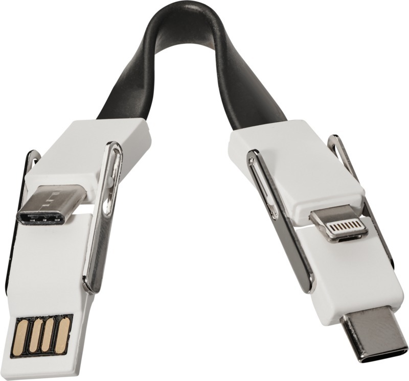 Кабель "4 в 1" позволяет заряжать любые устройства. Он оснащен разъемами USB Type A, Type-C и наконечником "2 в 1", совместимым как с устройствами iOS, так и с устройствами Android. Может использоваться как для зарядки, так и для передачи данных. Кабель оснащен брелоком и магнитами, обеспечивающими удобную переноску. Пластик ABS.