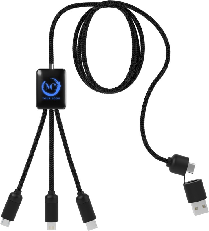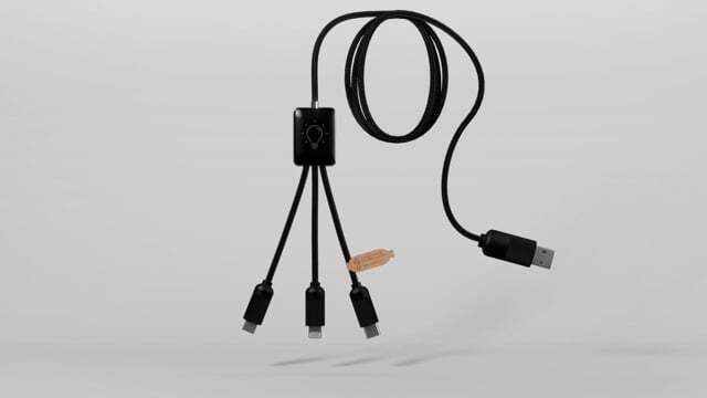 Кабель для зарядки с отделкой из резины и металла и светящимся логотипом. Оснащен тремя разъемами (Type-C, Android, iPhone) и выходами USB-A и USB-C. Можно заряжать до трех устройств одновременно. Длина кабелей (со штекерами): 10 см. Общая длина кабеля: 1 метр Кабель изготовлен из переработанного PET-пластика, а упаковка — из переработанной бумаги и переработанного пластика. Переработанный ABS пластик, Переработанный PET пластик.