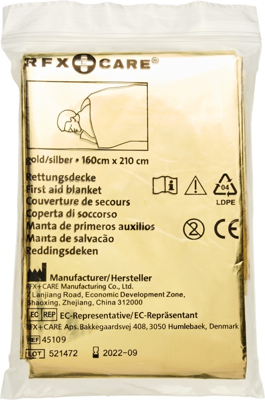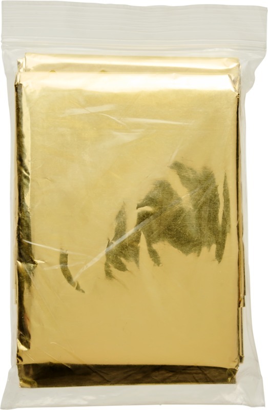 Спасательное одеяло, которое может обеспечить защиту от тепла, холода и влаги. Оно идеально подходит для туристических походов, занятий спортом, а также в чрезвычайных ситуациях. Когда сторона серебристого цвета прилегает к телу, она обеспечивает защиту от холода. Касающаяся тела сторона золотистого цвета будет сохранять прохладу. Размер одеяла — 160x210 см. Одеяло считается медицинским изделием класса I и тестируется и сертифицируется в соответствии с Директивой ЕС «О медицинских изделиях» MDD 93/42/EEC от 14 июня. Пластик PET.