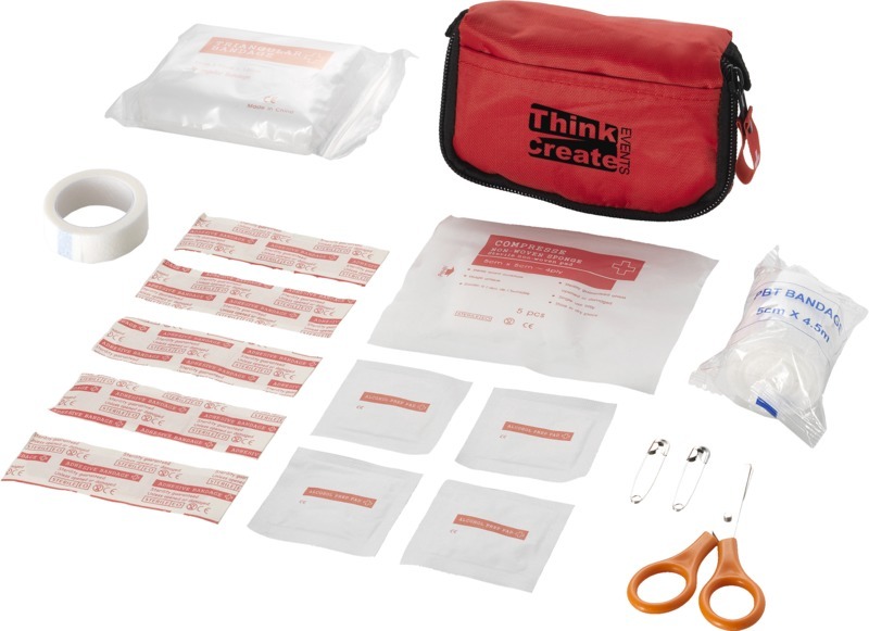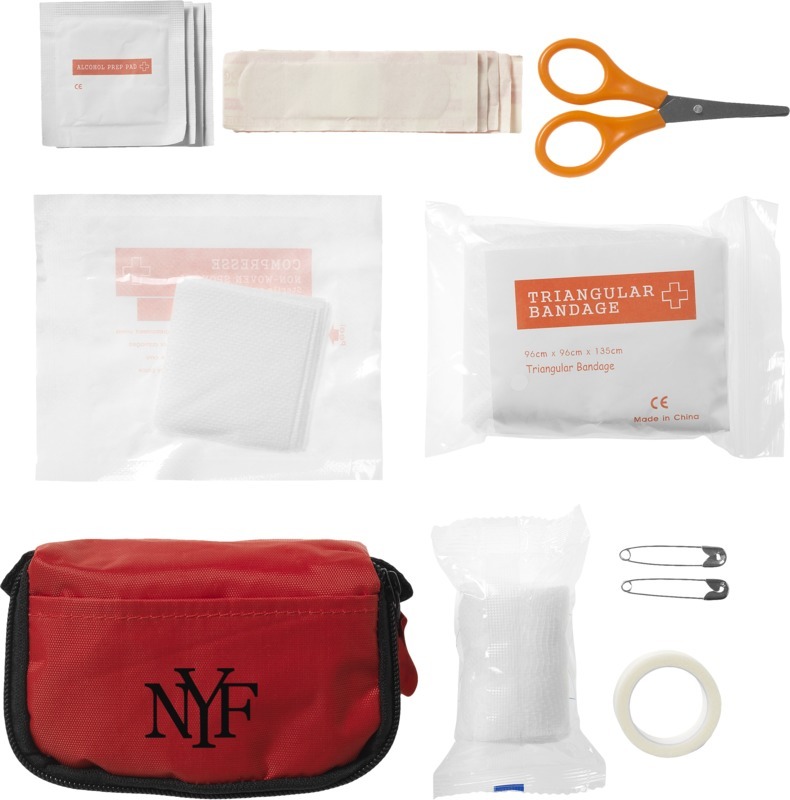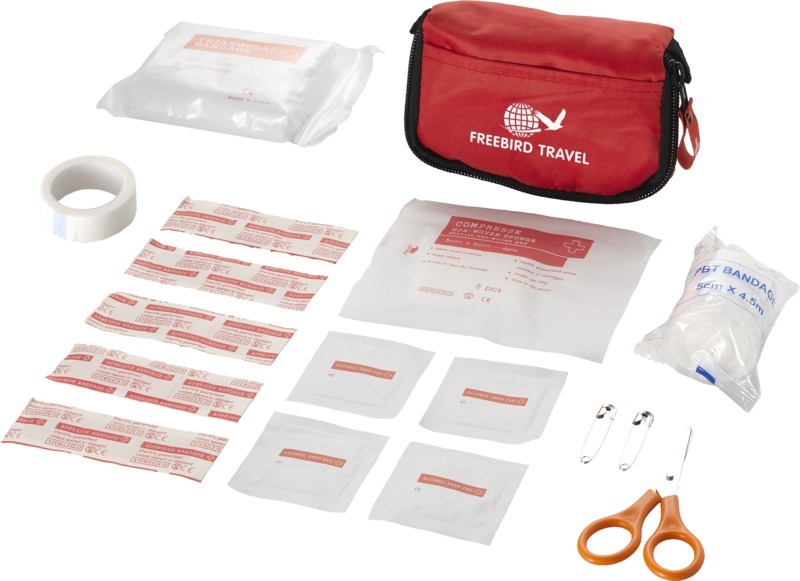 5 пластырей, 4 спиртовые подушки, повязка, треугольная повязка, 2 булавки, 5 марлей и ножницы в нейлоновой сумке. Соответствует EN13485. 70DНейлон.