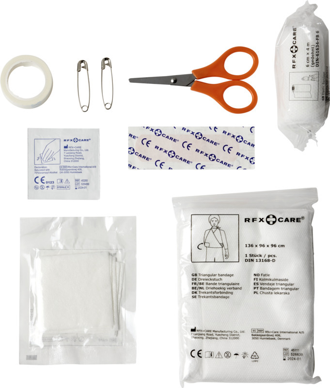 В чехле из ЭВА находятся 4 спиртовых тампона, 1 нетканая салфетка, 5 пластырей, 1 бумажная лента, 1 повязка, ножницы, 2 булавки и 1 треугольная повязка. Соответствует стандарту EN13485. EVA Plastic.