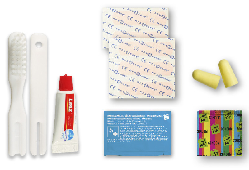 This is the ideal travel set for festivals and contains all the things needed for an overnight stay at a festival or party. The size of this kit allows you to easily store it in your bag or pocket. Contents: 1 toothbrush, 1 toothpaste, 1 earplugs, 1 antibacterial gel, 5 wash proof plasters, 1 condom. All of the first aid and care products within the kit meet all applicable EU regulations. Price includes full colour print. Пластик.