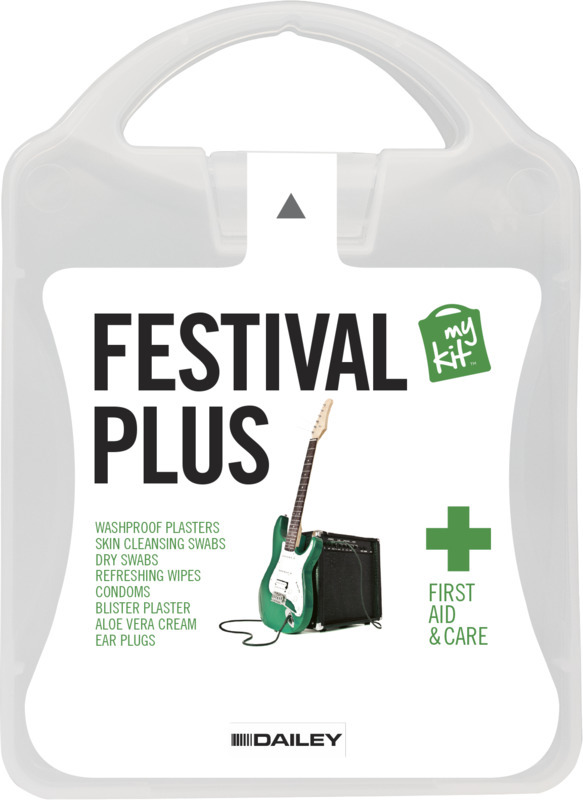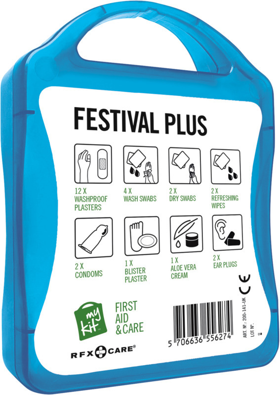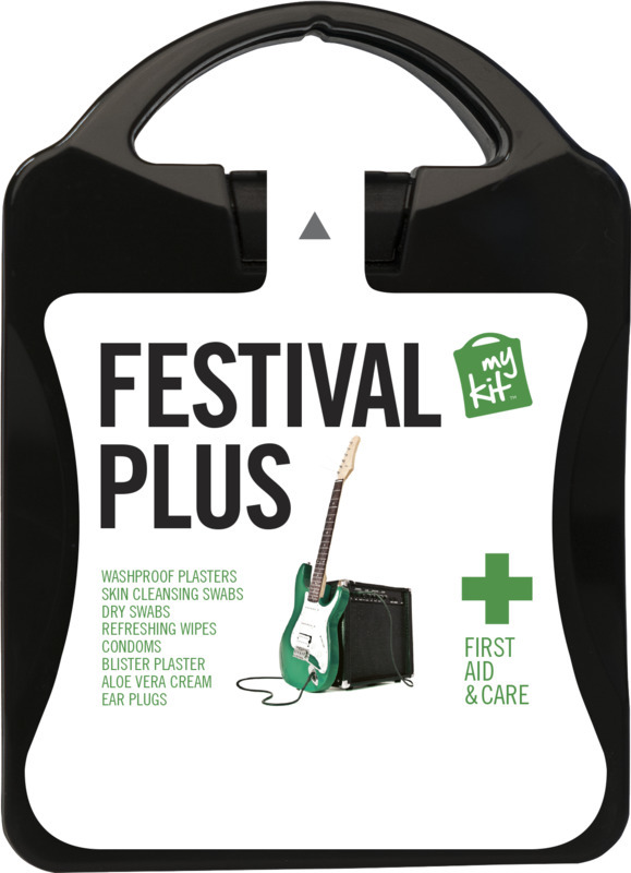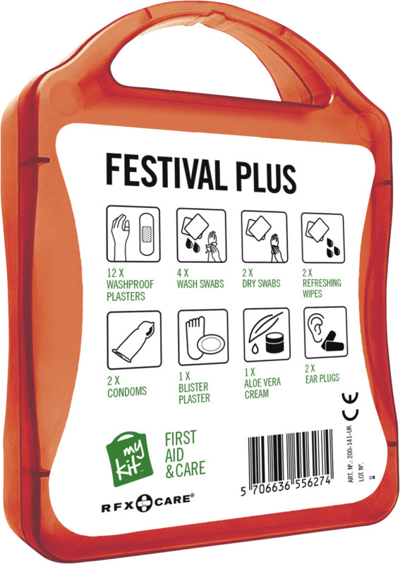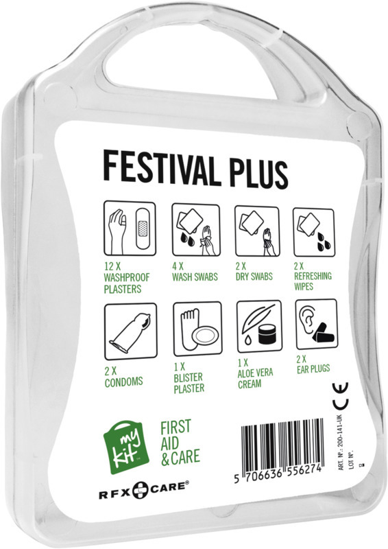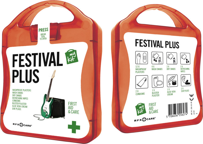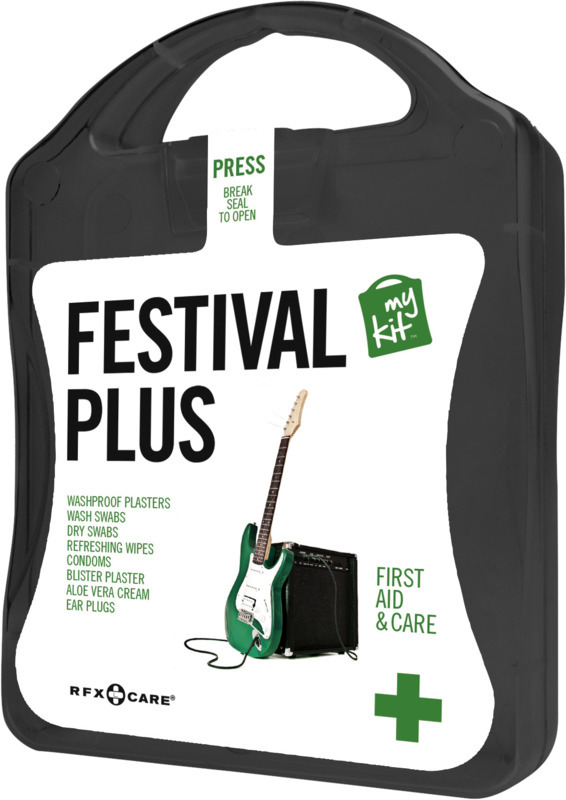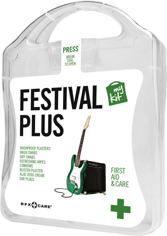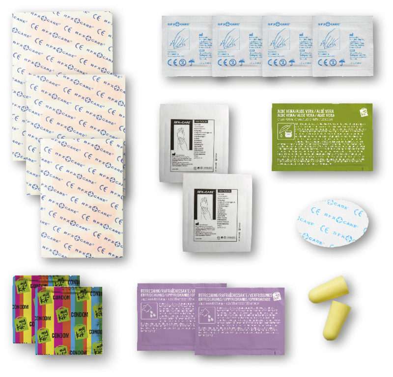The perfect first aid kit for every festival or party. This kit prepares you for every situation at any party or festival. Contents: 12 wash proof plasters, 4 skin cleansing swabs, 2 dry swabs, 2 refreshing wipes, 2 condoms, 1 blister plaster, 1 aloe Vera cream, 2 ear plugs. All of the first aid and care products within the kit meet all applicable EU regulations. Price includes full colour print. Пластик.