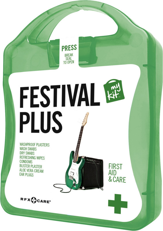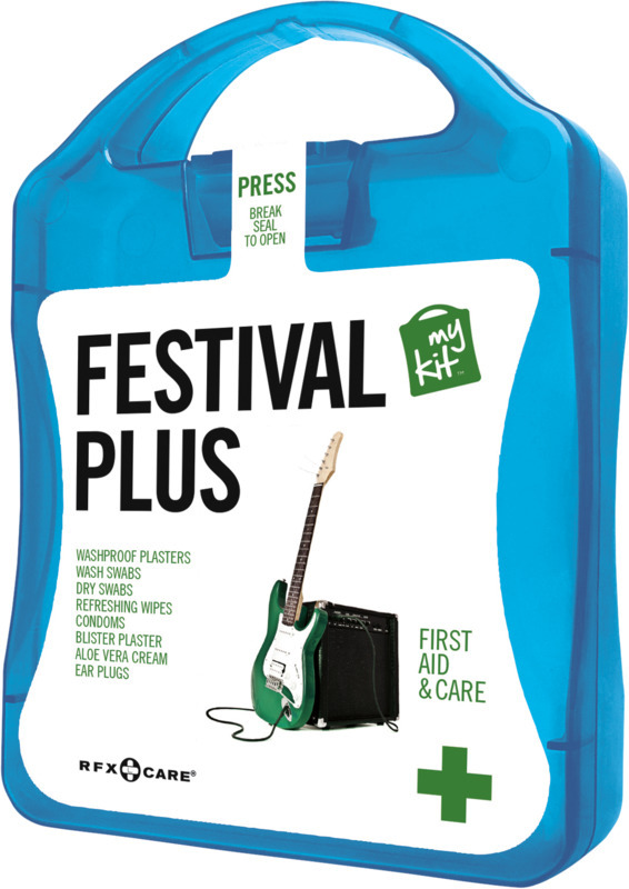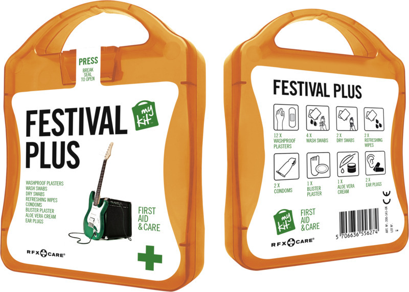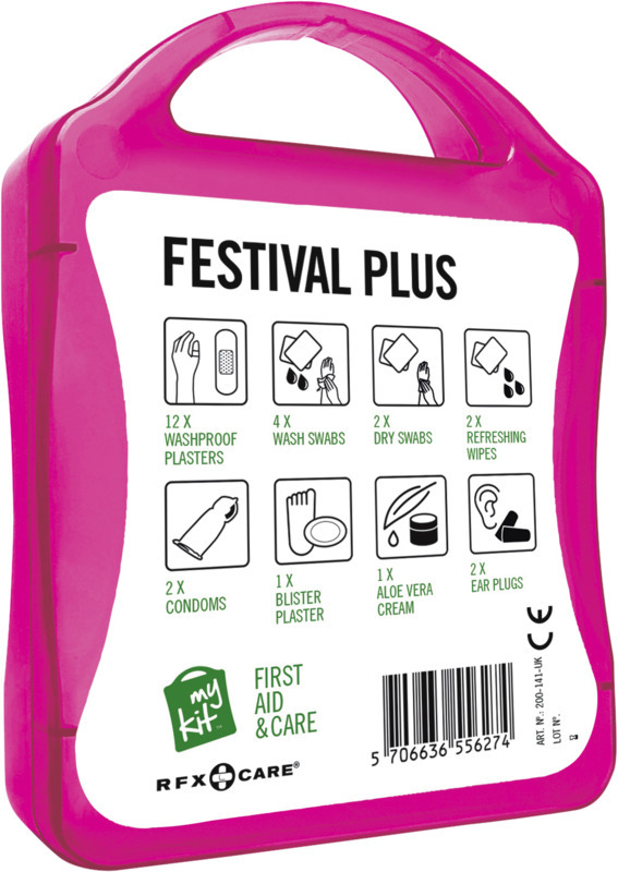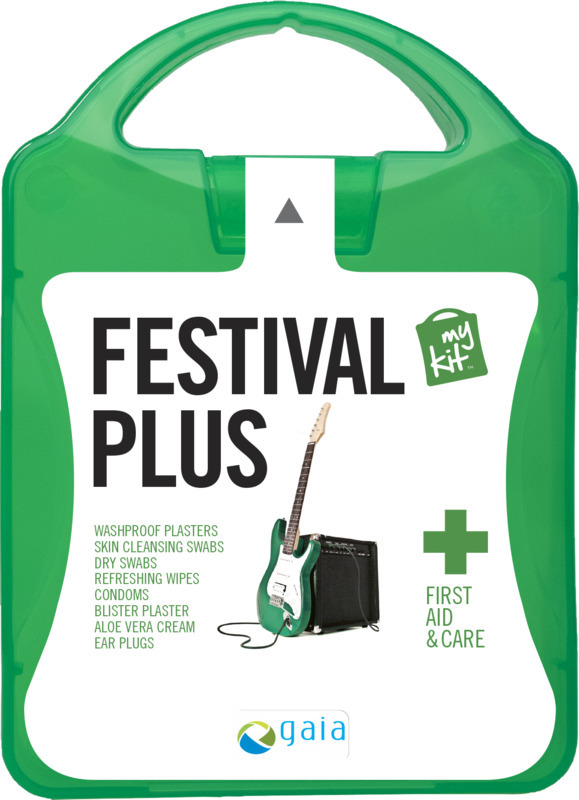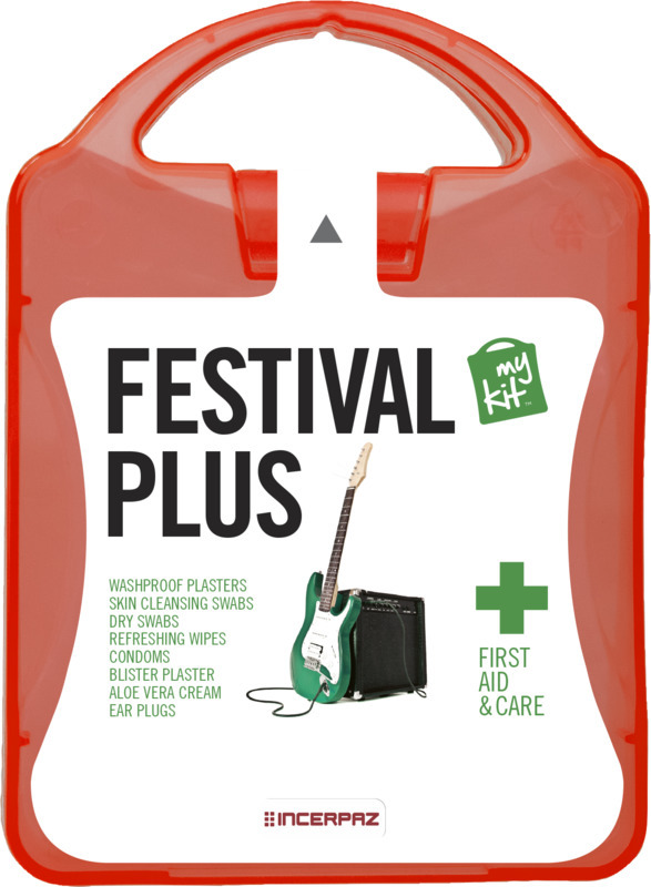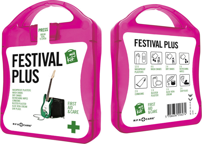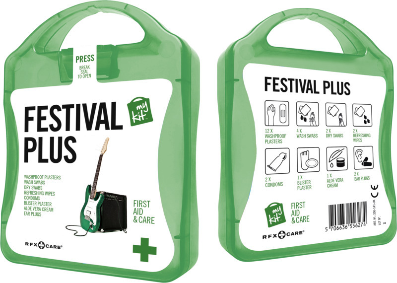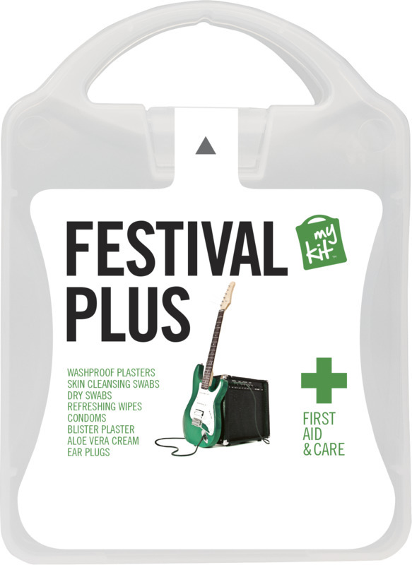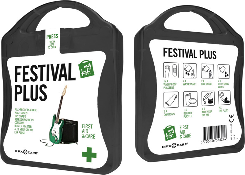 The perfect first aid kit for every festival or party. This kit prepares you for every situation at any party or festival. Contents: 12 wash proof plasters, 4 skin cleansing swabs, 2 dry swabs, 2 refreshing wipes, 2 condoms, 1 blister plaster, 1 aloe Vera cream, 2 ear plugs. All of the first aid and care products within the kit meet all applicable EU regulations. Price includes full colour print. Пластик.