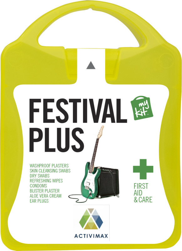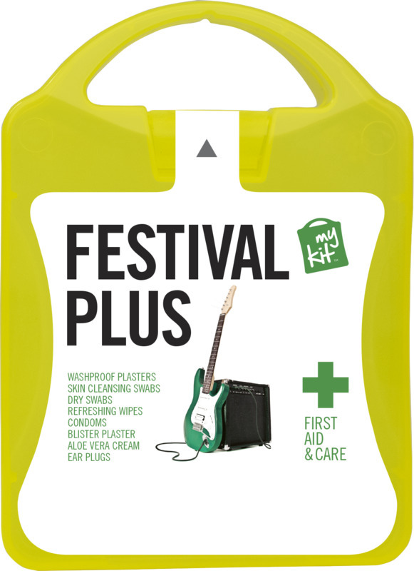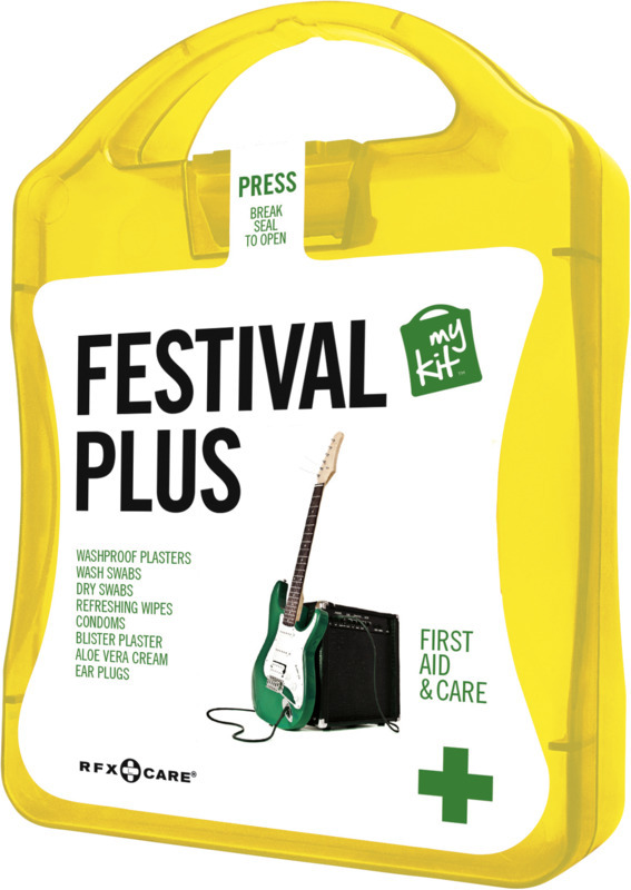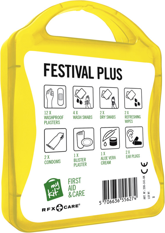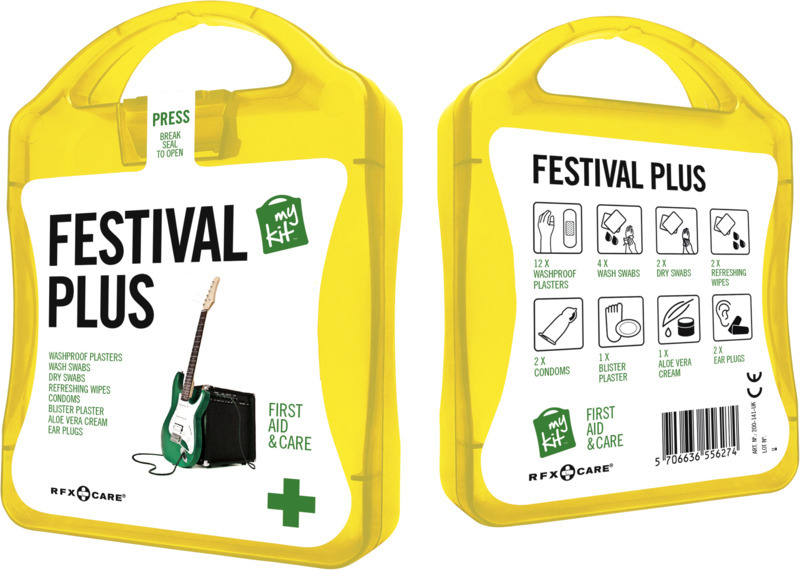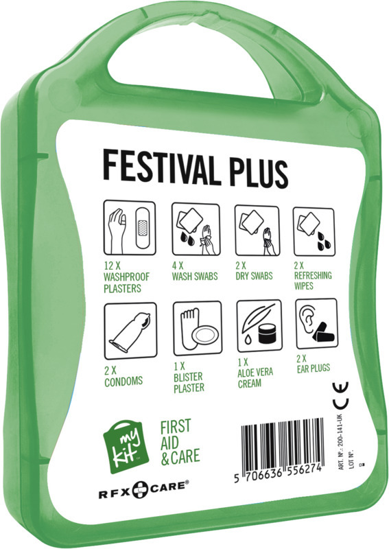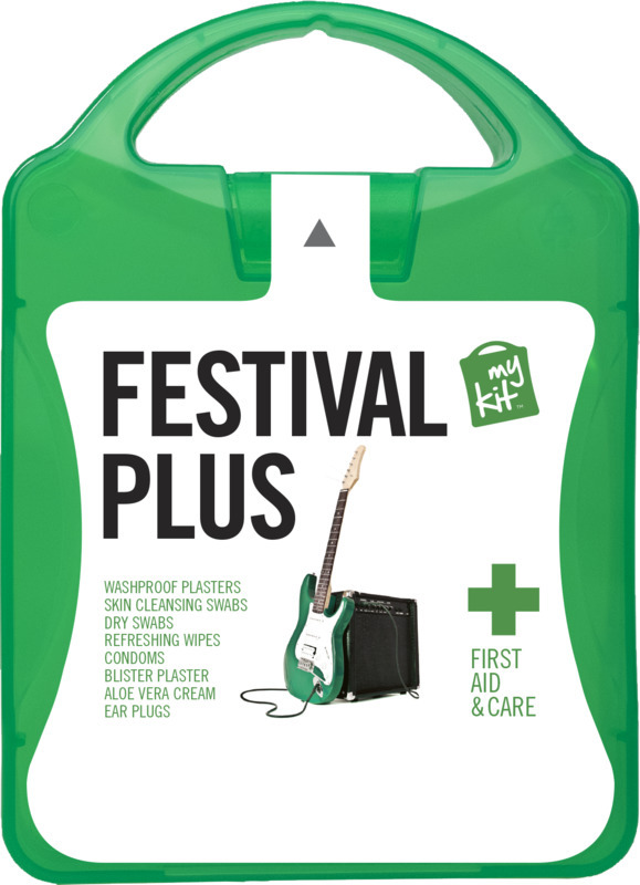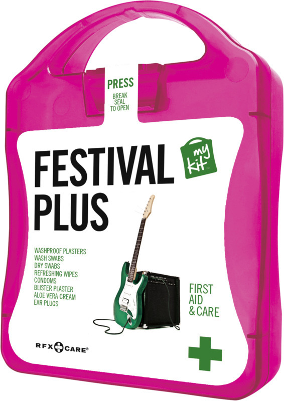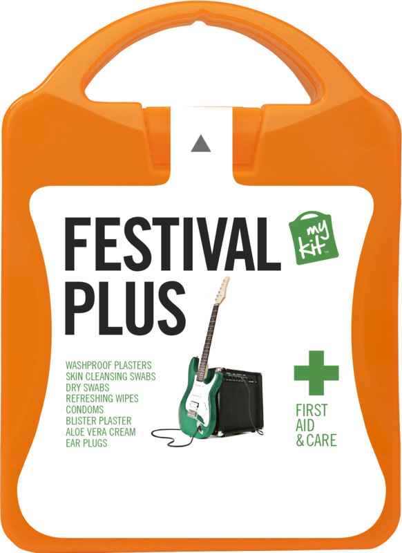 The perfect first aid kit for every festival or party. This kit prepares you for every situation at any party or festival. Contents: 12 wash proof plasters, 4 skin cleansing swabs, 2 dry swabs, 2 refreshing wipes, 2 condoms, 1 blister plaster, 1 aloe Vera cream, 2 ear plugs. All of the first aid and care products within the kit meet all applicable EU regulations. Price includes full colour print. Пластик.