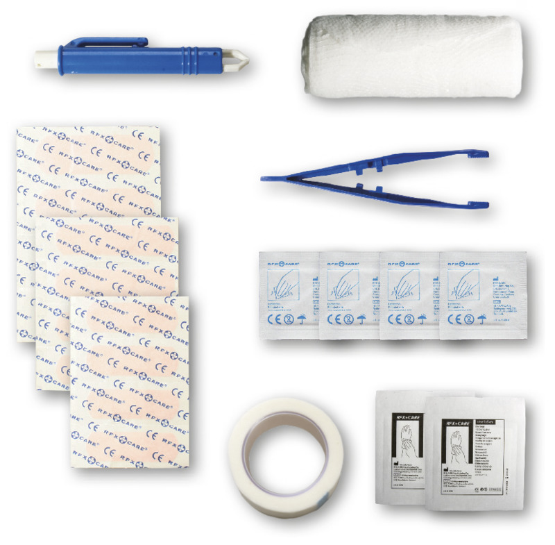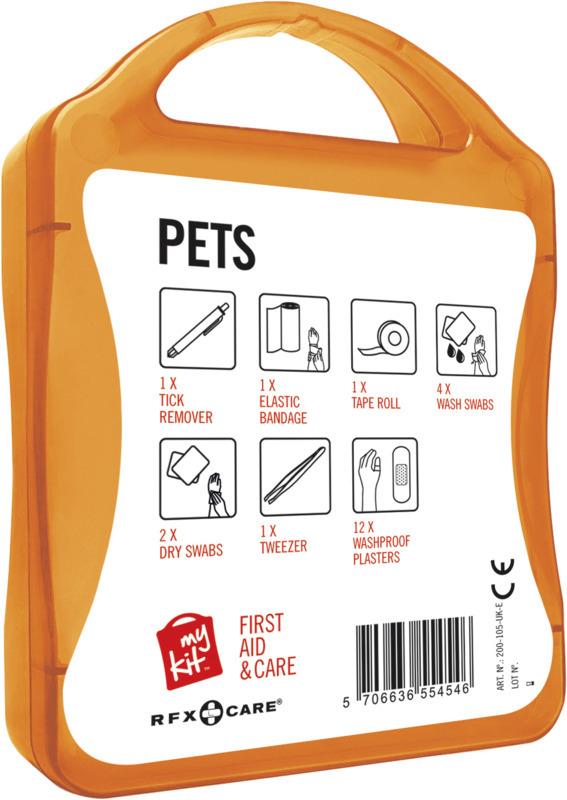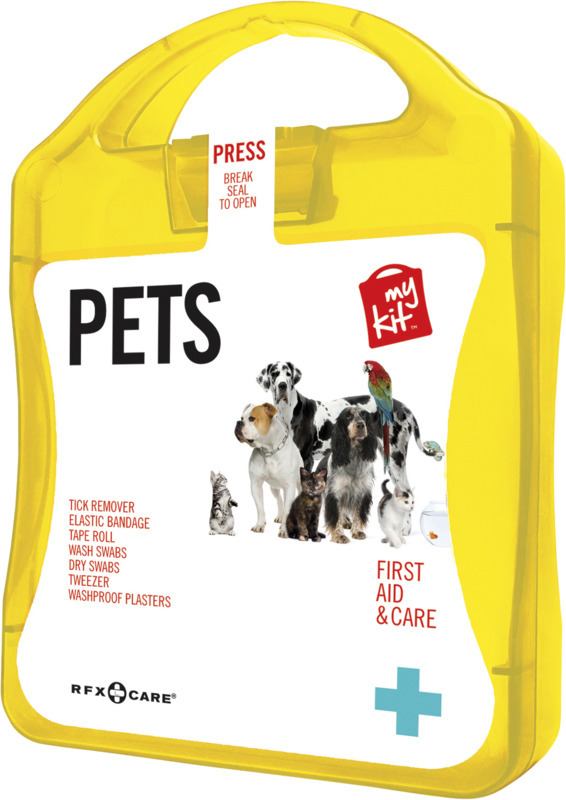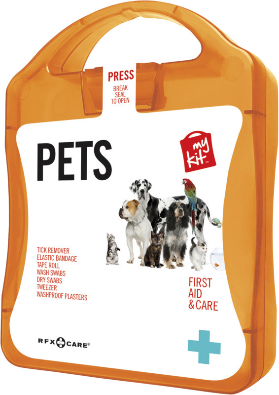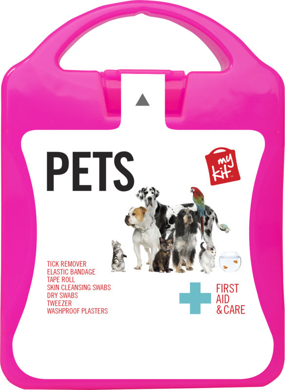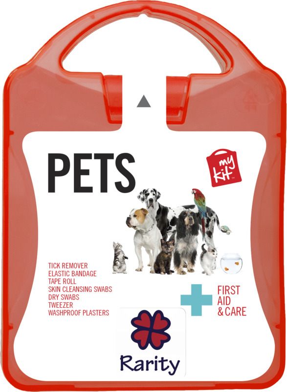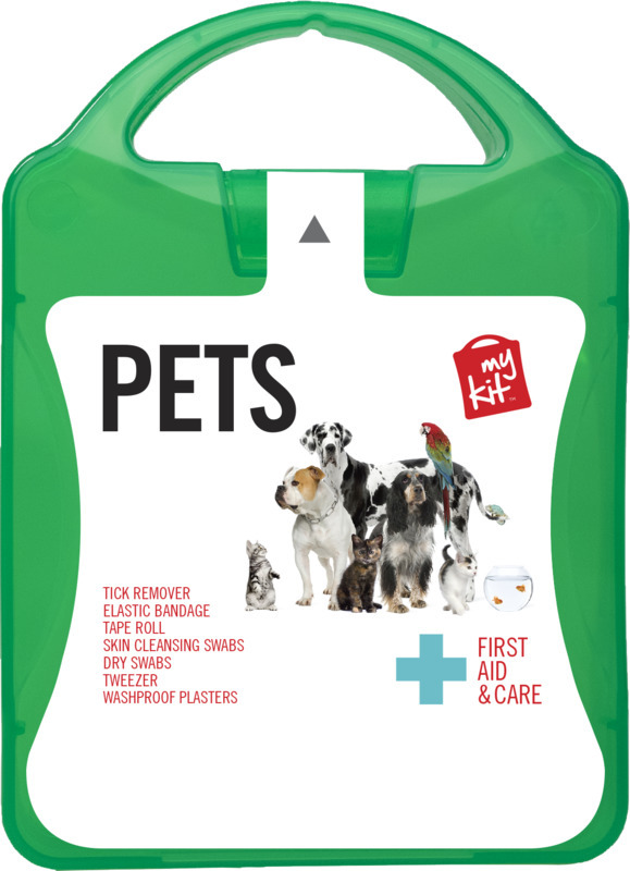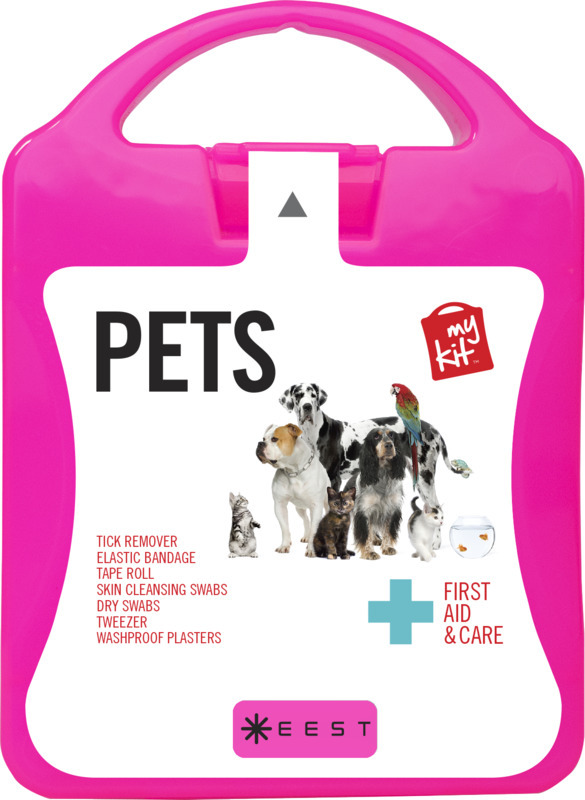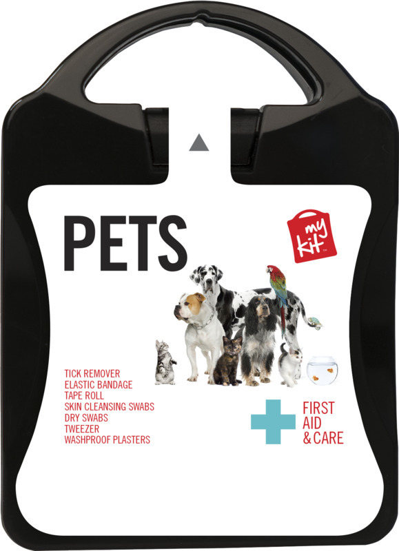 An ideal first aid kit for every pet owner. This kit prepares you for small injuries or accidents during walks and allows you to treat your pet after a tick bite. Contents: 12 wash proof plasters, 4 skin cleansing swabs, 2 dry swabs, 1 tick remover, 1 elastic bandage, 1 tweezer, 1 tape roll. All of the first aid and care products within the kit meet all applicable EU regulations. Price includes full colour print. Пластик.