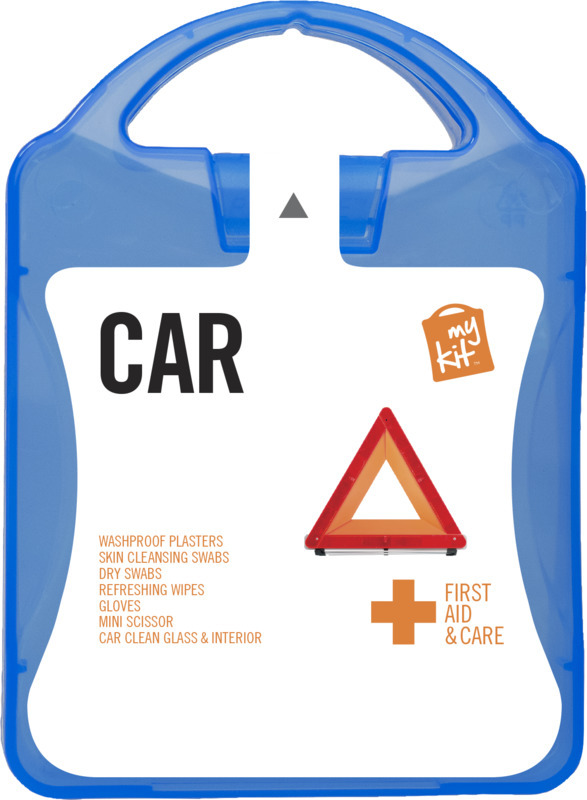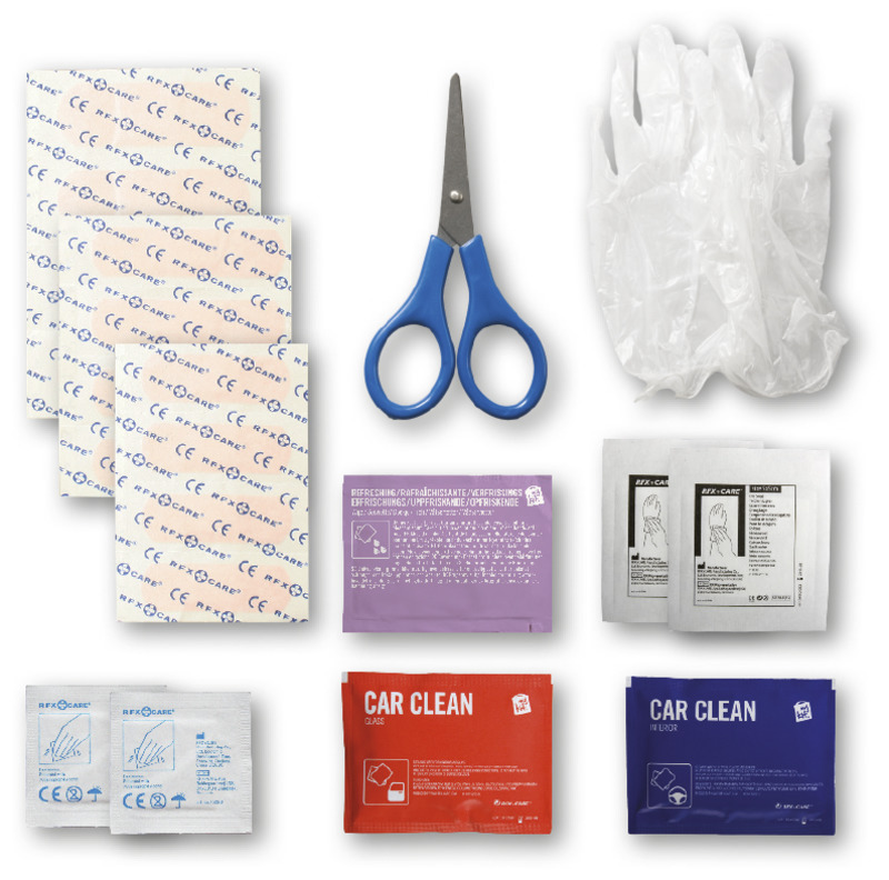This is an ideal first aid kit to have in every car. With this kit you will be prepared for small accidents and injuries during your journey. Contents: 12 wash proof plasters, 2 skin cleansing swabs, 2 dry swabs, 1 pair of disposable gloves, 1 car clean (2 pack), glass & interior wipe, 1 refreshing wipe, 1 mini scissor. All of the first aid and care products within the kit meet all applicable EU regulations. Price includes full colour print. Пластик.