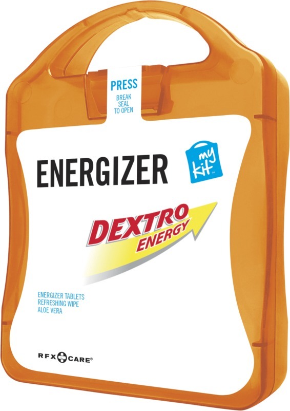Ideal set for when you need to re-energise. With this set you will able to refresh and energise yourself and still be prepared for small accidents and injuries. Contents: 12 wash proof plasters, 2 energizing tablet packs (4pcs), 1 refreshing wipe, 1 aloe Vera, 4 skin cleansing swabs, 2 dry swabs. All of the first aid and care products within the kit meet all applicable EU regulations. Price includes full colour print. Пластик.