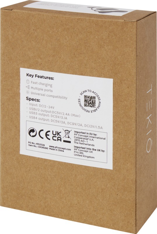 Это зарядное устройство предназначено для семейного отдыха и путешествий, позволяя пассажирам на задних и передних сиденьях одновременно заряжать свои электронные устройства во время поездки. Универсальная совместимость с автомобилями 12/24 В. Протокол быстрой зарядки Qualcomm 3.0. Выход USB1/2: DC5В/2,4A, выход USB3: DC5В/3,1A, выход USB4: DC5В/3A, DC9В/2A, DC12В/1,5A. Длина кабеля: 170 см. Пластик ABS.