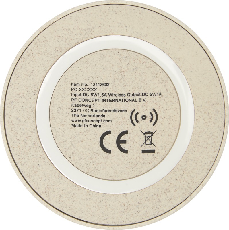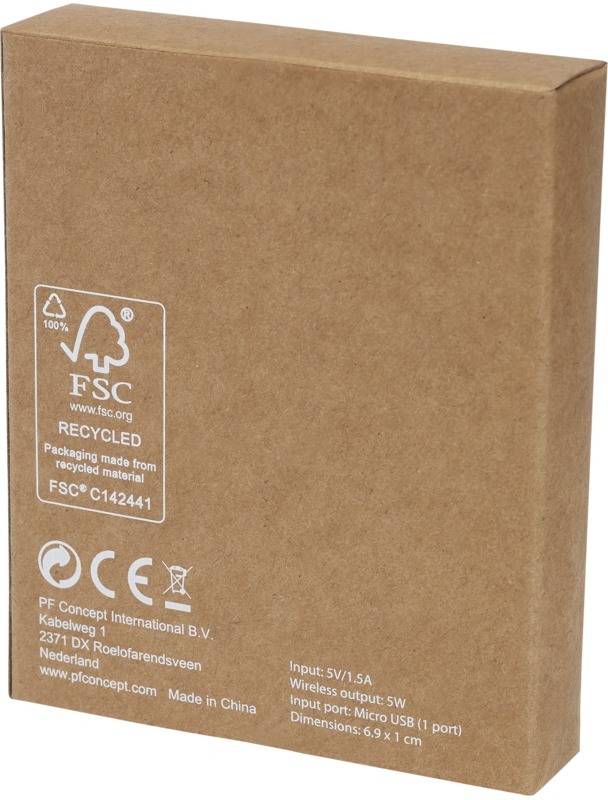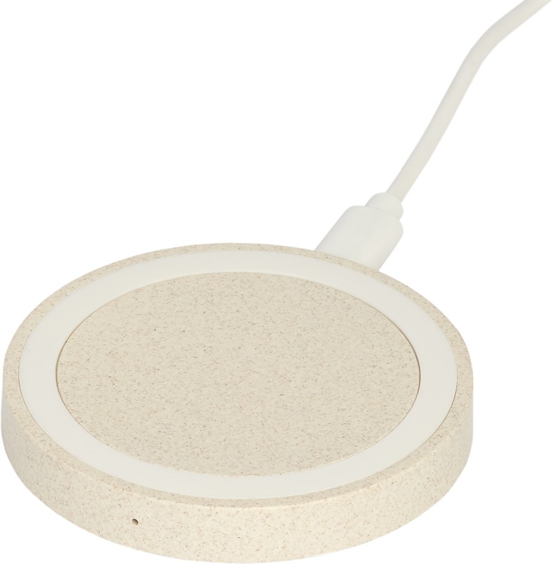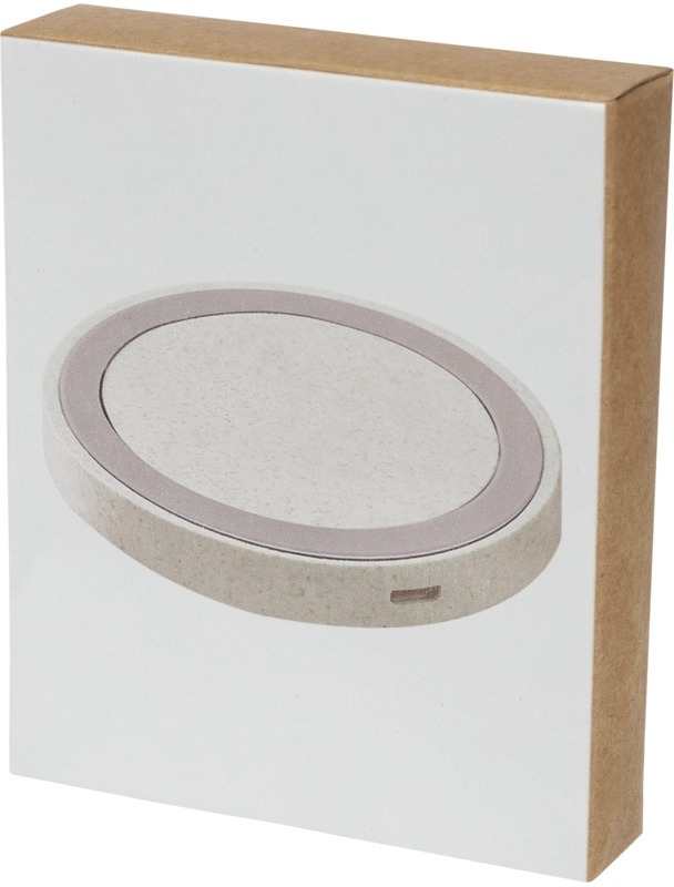 Беспроводное зарядное устройство на 5 Вт изготовлено из смеси пшеничной соломы и пластика, что способствует снижению потребления пластика. Для зарядки устройств, не поддерживающих беспроводную технологию, требуется внешний приемник для беспроводной зарядки или чехол-приемник. Поставляется в подарочной упаковке, сертифицированной FSC, и с распечатанным руководством от FSC. В комплект входит кабель для зарядки Type-C. 40% Wheat straw, 60% Пластик PP.