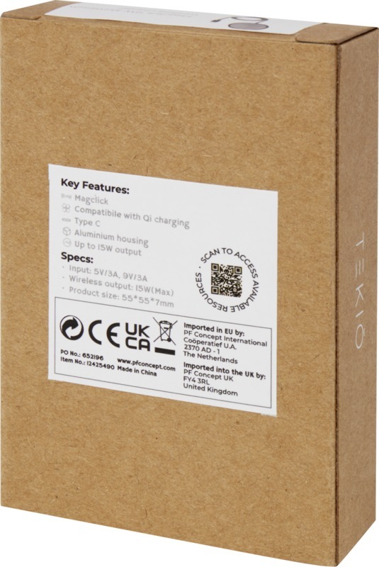 Стильное алюминиевое беспроводное зарядное устройство на магните с выходной мощностью 15 Вт для быстрой зарядки. Совместим со всеми устройствами Qi (iPhone 8 и выше и устройствами Android, поддерживающими беспроводную зарядку). Поставляется в коробке из крафт-бумаги премиум-класса и красочной наклейкой. Алюминий.