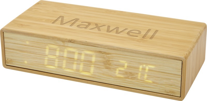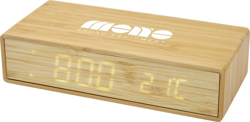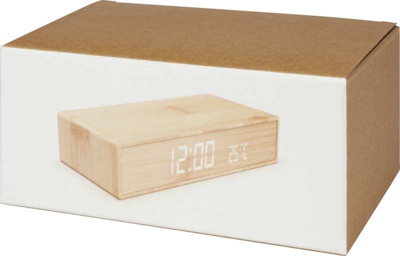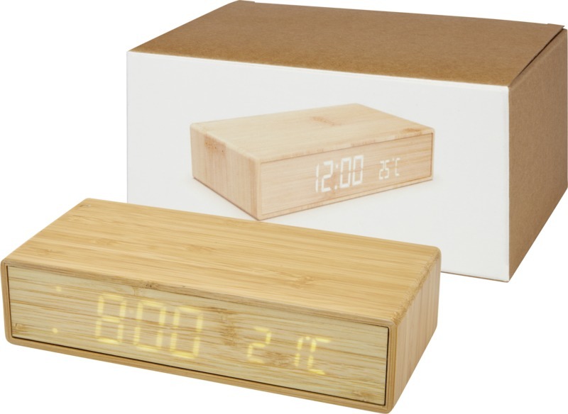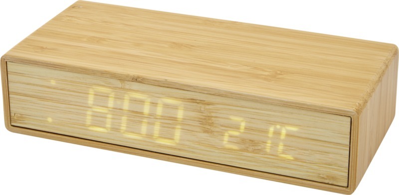 Настольные часы с беспроводной зарядкой Minata идеально подходят для любого офисного стола или прикроватной тумбочки. На верхней поверхности находится беспроводное зарядное устройство 10 Вт для совместимых устройств. Часы имеют функцию будильника, могут показывать температуру по Фаренгейту или Цельсию, а также настроены на три различных уровня яркости света. Имеется дополнительный выход USB (5 В/1,5 А) для зарядки через кабель. Совместимость со всеми устройствами Qi (iPhone 8 и более поздние версии, устройства Android, поддерживающие беспроводную зарядку). Поставляются в подарочной коробке с инструкцией по эксплуатации (все изготовлено из экологичных материалов). Бамбуковое дерево. Упаковка: FSC Recycled 100% P5.1 CU-COC-877277.