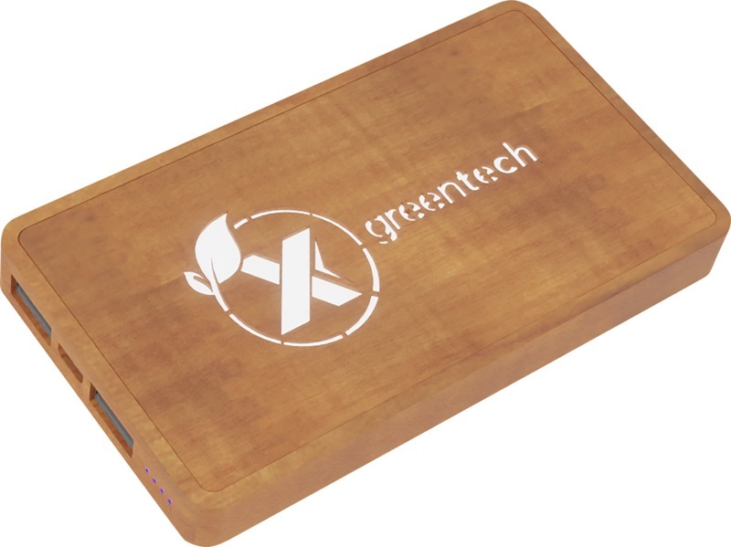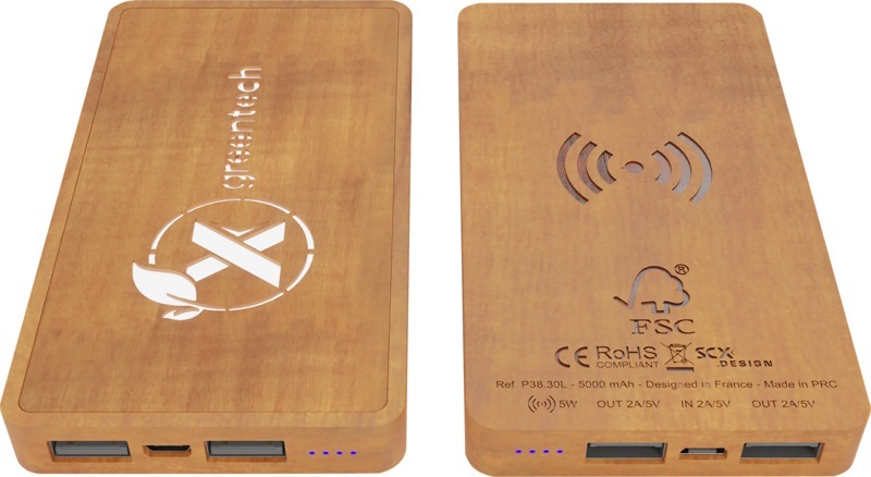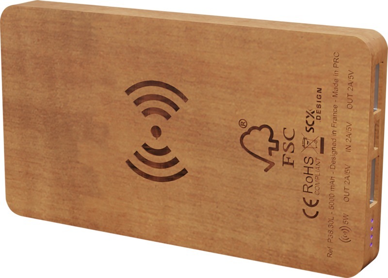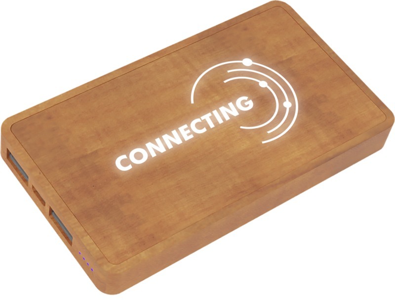 Портативное зарядное устройство емкостью 5000 мАч (12,5 x 7 x 1,1 см) с функцией беспроводной зарядки мощностью 5 Вт. Портативное зарядное устройство имеет два выхода USB 2A и изготовлено из кленовой древесины, полученной из устойчивых, экологически и социально ответственных источников. Деревянная поверхность идеально подходит для нанесения лазерной гравировки, логотип устройства светится при его использовании. Поставляется с зарядным кабелем 3-в-1 (type C, micro-USB, iPhone) из переработанного ПЭТ-пластика. Упаковывается в подарочную коробку (20,1 x 10 x 2 см) с магнитной застежкой. Гарантия 3 года. Дерево, Переработанный PET пластик.
