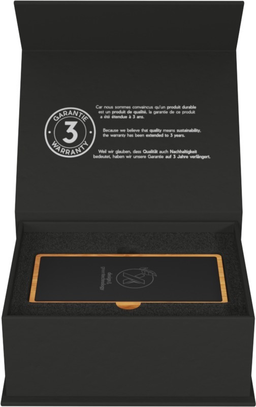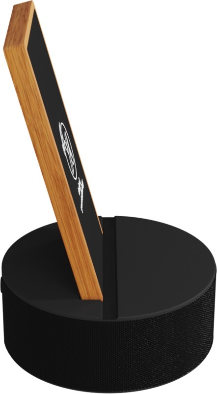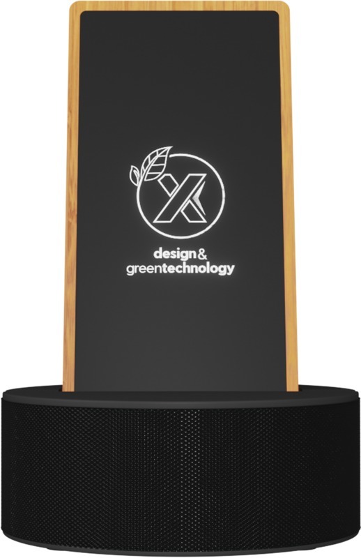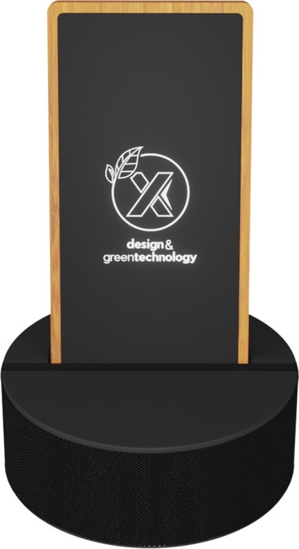 Акустическая станция с подсветкой логотипа и двумя различными функциями. База представляет собой мощный динамик Bluetooth® мощностью 2x3 Вт со встроенным микрофоном для конференц-связи. Сертифицированное бамбуковое индукционное зарядное устройство магнитно интегрировано в динамик и позволяет вам заряжать телефон, совместимый с индукционной зарядкой, с мощностью 10 Вт. Автономность батареи составляет около 3 часов. Для оптимального использования изделия (динамик + зарядка 10 Вт) рекомендуется использовать прилагаемый кабель для зарядки. Поставляется с зарядным кабелем из переработанного ПЭТ-пластика. Размер акустической станции: 9 х 14 см. Упакована в подарочную коробку (14 x 11 x 5,5 см) с магнитной застежкой. Гарантия 3 года. Бамбуковое дерево, Пластик ABS, Переработанный PET пластик.