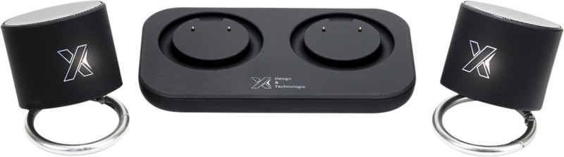 Станция с двумя динамиками мощностью 2 x 3 Вт, светящимся логотипом, встроенным микрофоном и функцией конференц-связи. Динамики могут быть соединены для создания стереозвука, а при размещении на базе их можно заряжать от беспроводной зарядки. Емкость: 3,7 В/500 мАч. Частота: 120 Гц – 16 кГц. Выходная мощность: 2 x 3 Вт. Входная мощность: 5 Вт. Bluetooth® 4.2. Вес нетто: 100 грамм Размер: ø 50 x 46,5 мм. Поставляется в подарочной коробке с магнитной застежкой, изготовленной из бумаги вторичной переработки. Пластик ABS, Алюминий.
