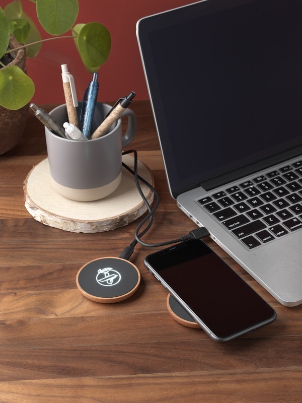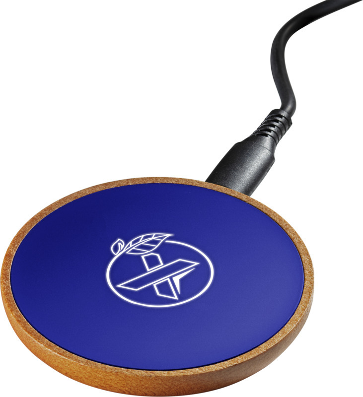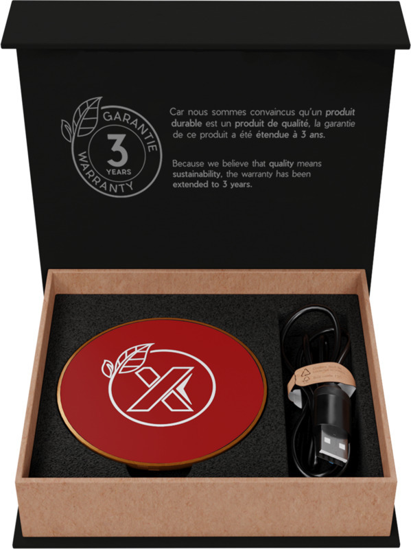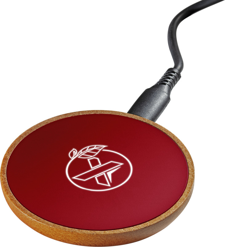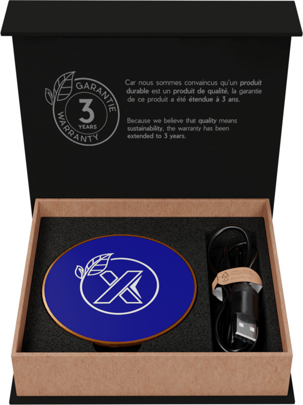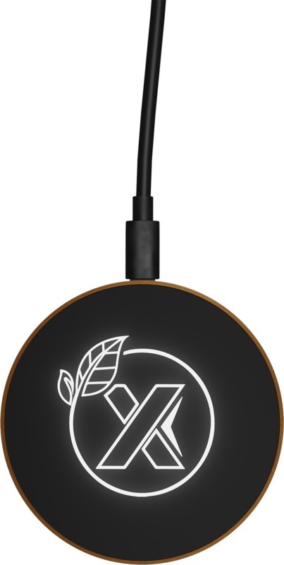 Беспроводная зарядная станция мощностью 10 Вт, изготовленная из резины и дерева (сертификат FSC), с зарядным кабелем из переработанных пластиковых бутылок. Возможно нанесение логотипа с подсветкой. Поставляется в подарочной коробке из черной крафт-бумаги с магнитной защелкой. Патент Ведомства по интеллектуальной собственности Европейского союза. Пластик ABS, Резина, Переработанный PET пластик.