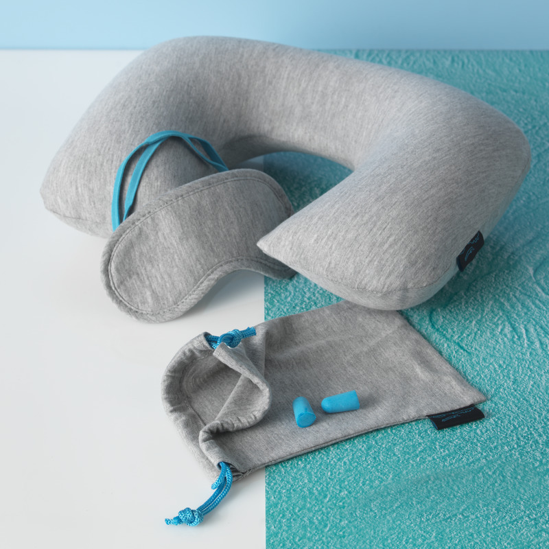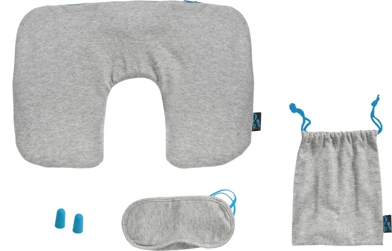 Удобный дорожный набор включает надувную подушку с ярко-синей молнией, маску для глаз с ярко-синей резинкой и ярко-синие беруши в мягком чехле с ярко-синей кулиской. Полиэстер, Хлопок.