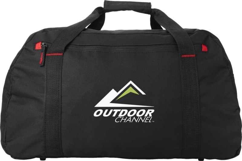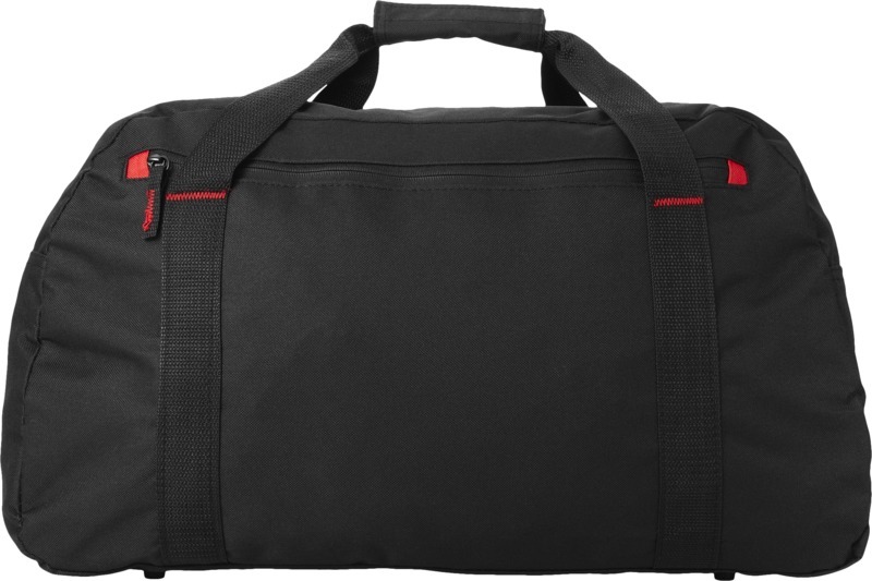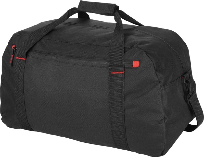 Большая дорожная сумка с красным элементом отделки, передним карманом на молнии и регулируемым плечевым ремнем. 600DПолиэстер.