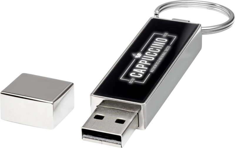 Прямоугольный USB-накопитель с ярким подсвечивающимся логотипом (подсветка белого или синего цвета). В наличии накопители с объемом памяти от 1 до 64 ГБ. . Цинковый сплав, Пластик.