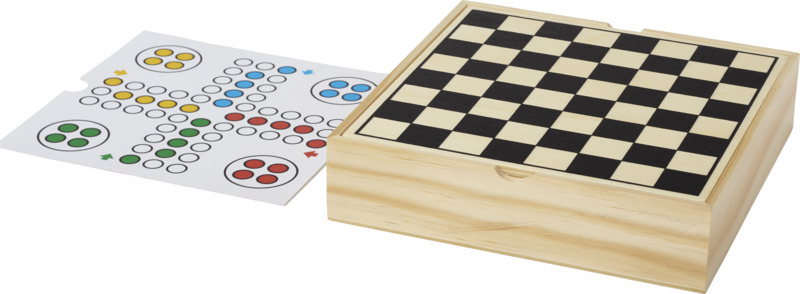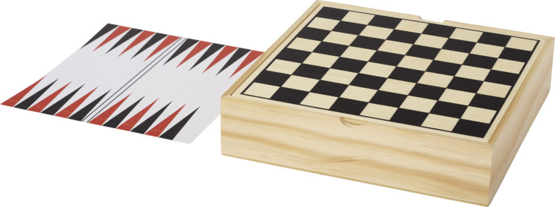 Деревянный чемоданчик, содержащий несколько игр: нарды, шахматы, шашки, домино, лудо, микадо и всевозможные карточные игры. Две боковые крышки с плоской поверхностью для нанесения и доска для шахмат и шашек сзади. Дополнительный вкладыш для людо и нард. Инструкции прилагаются. Дерево.