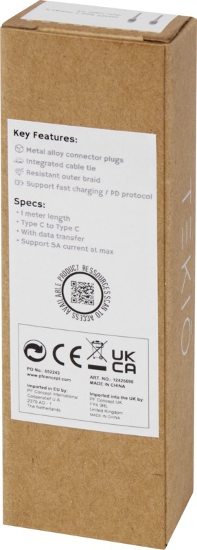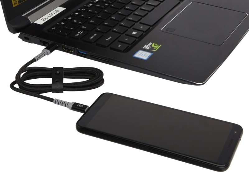 Стильный и высококачественный зарядной кабель с нейлоновой оплеткой. Двусторонний USB-C-кабель с поддержкой технологии Power Delivery (PD) и передачи данных. Поддержка тока до 5А. Поставляется с хомутом для кабелей для удобного хранения. Поставляется в коробке из крафт-бумаги премиум-класса и красочной наклейкой. Алюминий, Нейлон.