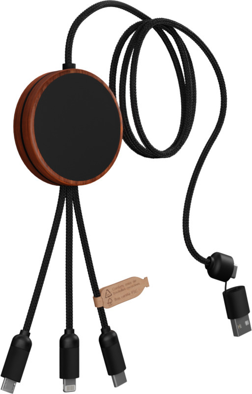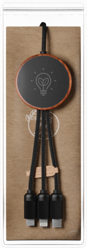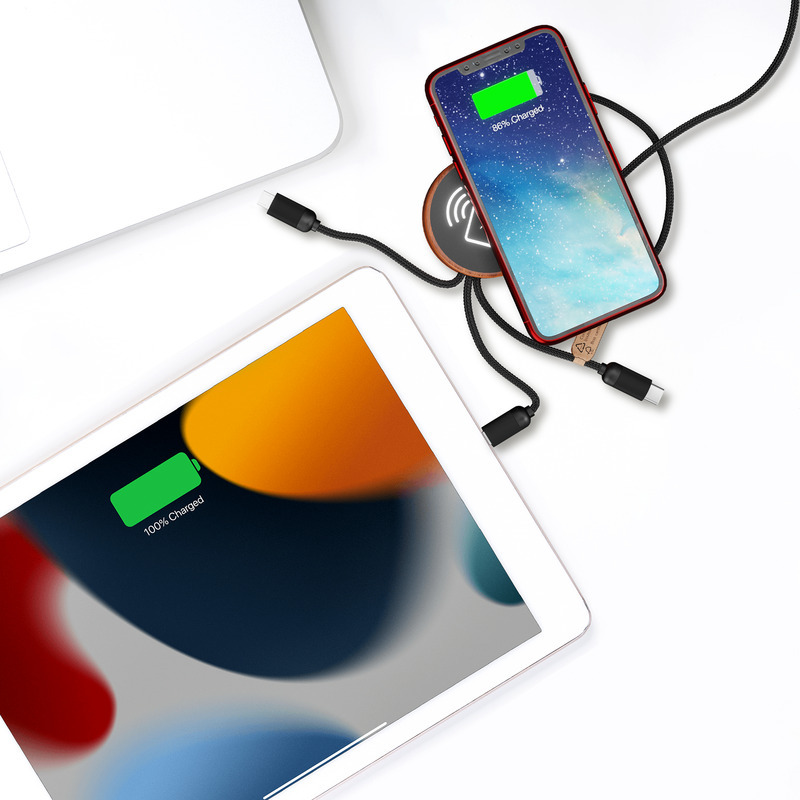 Зарядный кабель 5 в 1 из переработанного PET-пластика со светящимся логотипом и беспроводное зарядное устройство мощностью 10Вт Имеет 3 разъема (type C, micro USB, iPhone) и двойной разъем USB для универсального использования. Поставляется в сумке TPU с карточкой из крафт-бумаги. Длина кабеля: 1 метр Гарантия 3 года. Переработанный PET пластик, Бамбуковое дерево.