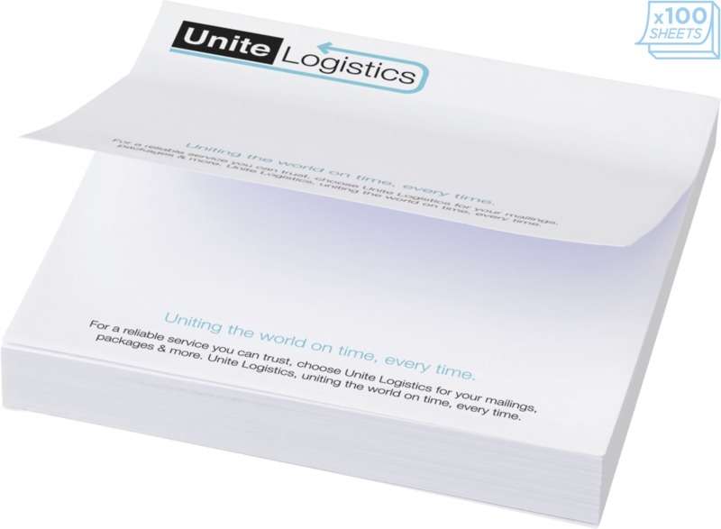 Бумага для заметок Sticky-Mate®. Состоит из чистых листов 80 г/м². Стандартный вариант состоит из 50 листов, а также доступно по 25 и 100 листов. На каждый лист можно нанести полноцветный рисунок. Размеры листа: 100x100мм. Бумага, 80 g/m2. FSC Mix Credit P7.7 CU-COC-877277.
