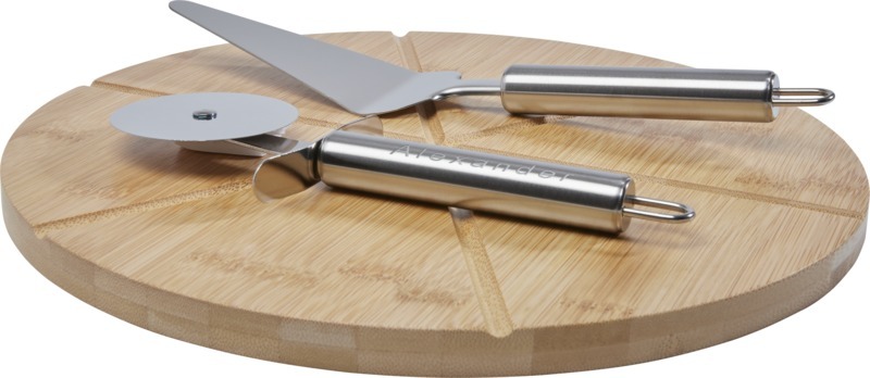 Бамбуковая лопатка для пиццы с 6 канавками для разделения на порции и нарезания, нож и поднос для пиццы. Используемый бамбук поставляется и производится в соответствии со стандартами устойчивого развития. Бамбуковое дерево, нержавеющая сталь.
