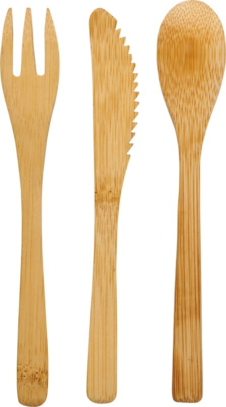 Набор столовых приборов из бамбука состоит из вилки, ножа и ложки. Поставляется в нетканом мешочке. Бамбуковое дерево.