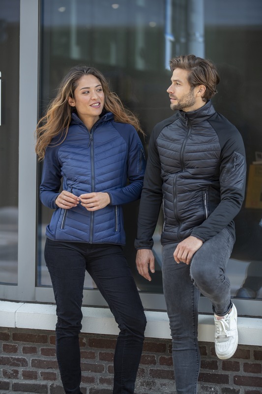 Dull cire 380T woven with water repellent and downproof finish of 100% Nylon, 38 g/m2, Contrast fabric, Interlock knit of 94% Polyester and 6% Elastane, 245 g/m2, Padding/filling, fake down insulation of 100% Polyester