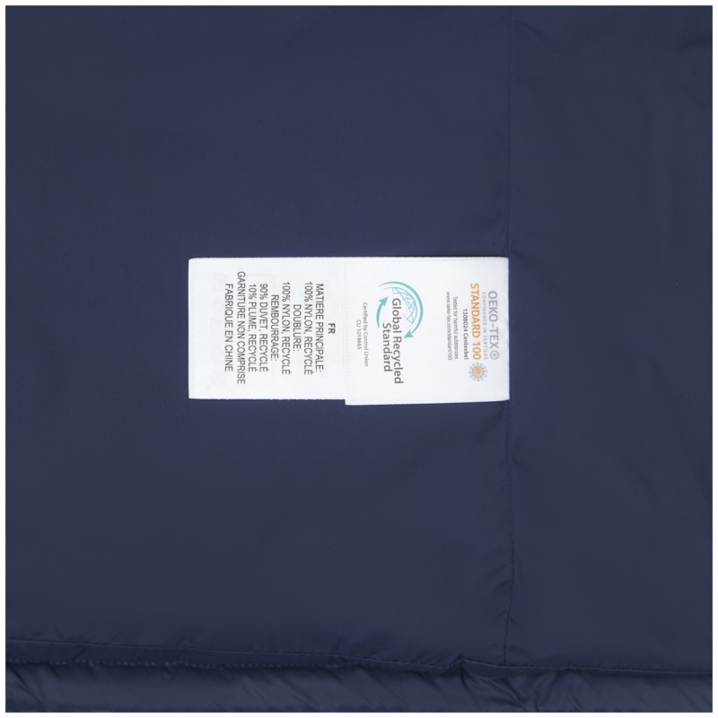 Dull cire 380T woven with water repellent and downproof finish of 100% GRS certified recycled nylon, Padding/filling, Down insulation: Responsible Down Standard (RDS) of 90% Recycled down and 10% Recycled feathers, 115 g/m2