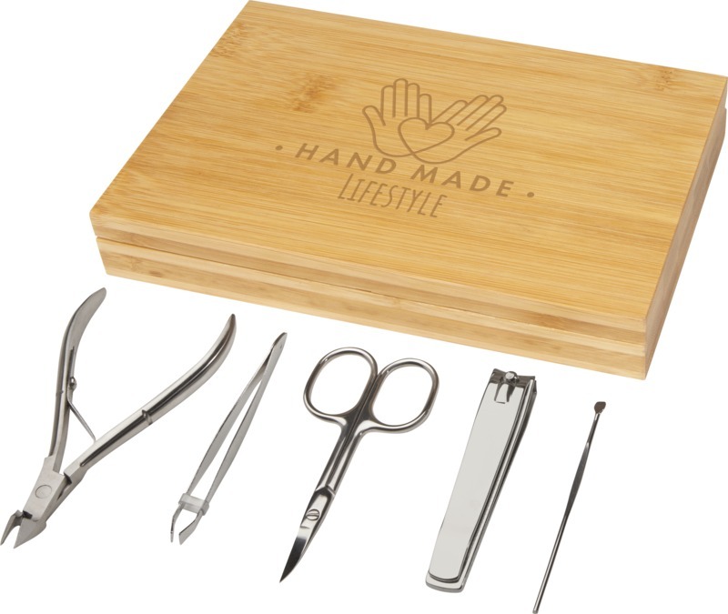 Высококачественный, красиво сделанный бамбуковый набор для маникюра, в который входят: ножницы для кутикул (10,3 x 4,3 x 1 см), ушной пинцет (8 см), кусачки для ногтей пальцев рук и ног (8 x 1,5 x 1,5 см), пинцет (8,5 x 0,7 см) и ножницы (9,5 x 4,2 см). Используемый бамбук поставляется и производится в соответствии со стандартами устойчивого развития. Бамбуковое дерево, нержавеющая сталь.