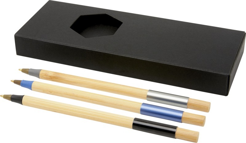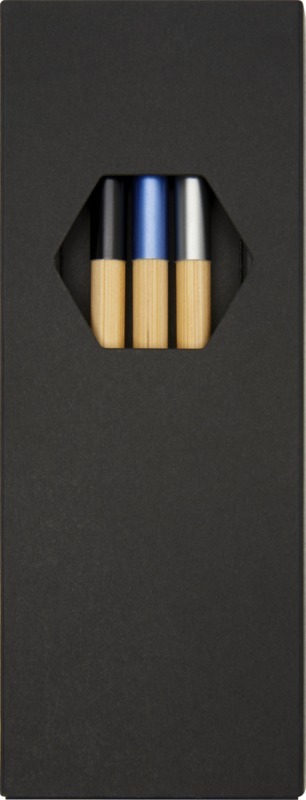 Комплект шариковых ручек с эксклюзивным дизайном, состоящий из трех шариковых ручек с цветовым акцентом. Шариковая ручка с синей алюминиевой пластиной предварительно заполнена синими чернилами, а две другие ручки предварительно заполнены черными чернилами. Упакован в черную подарочную коробку. Бамбуковое дерево, Алюминий.