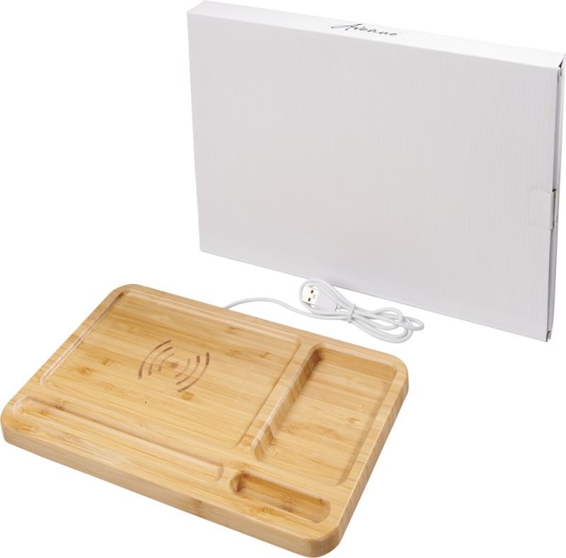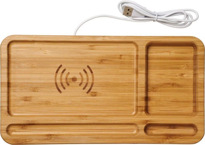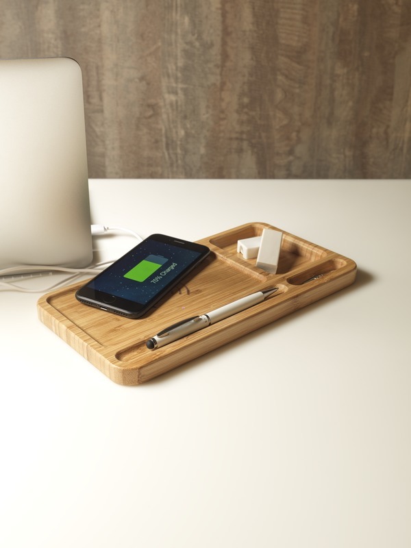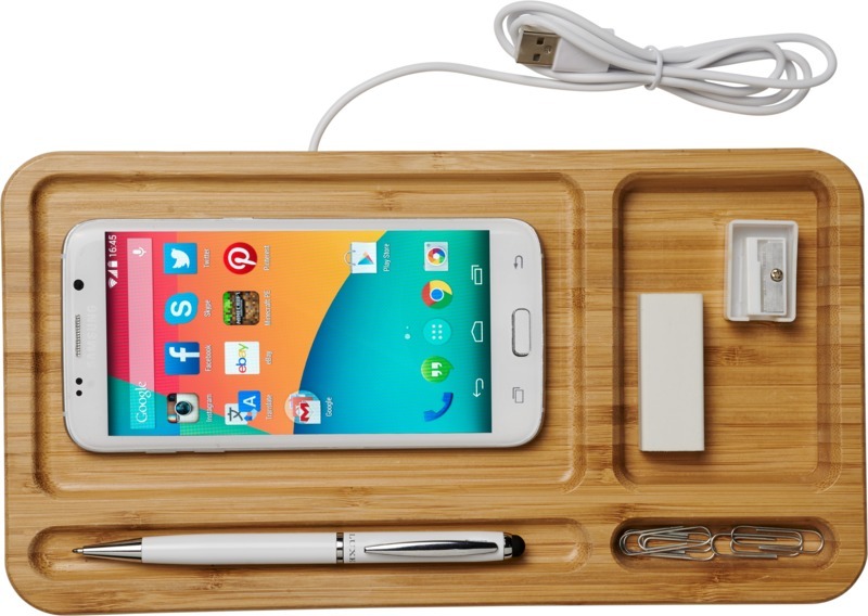 Экологический выбор! Настольный органайзер изготовлен из настоящего бамбука и помогает поддерживать порядок и заряжать телефоны без проводов. Поддерживает беспроводную зарядку совместимых устройств до 1 А. Для зарядки телефонов iPhone 7 и более ранних моделей (без беспроводной технологии) требуется внешний приемник для беспроводной зарядки или коробка приемника. Бамбуковое дерево.