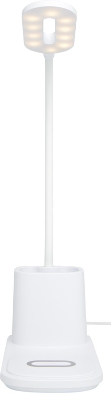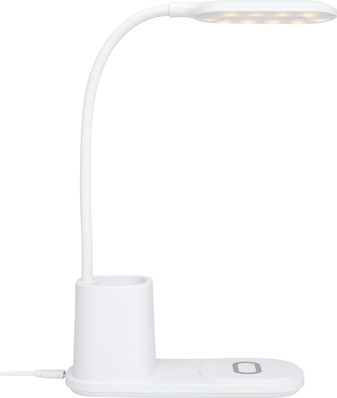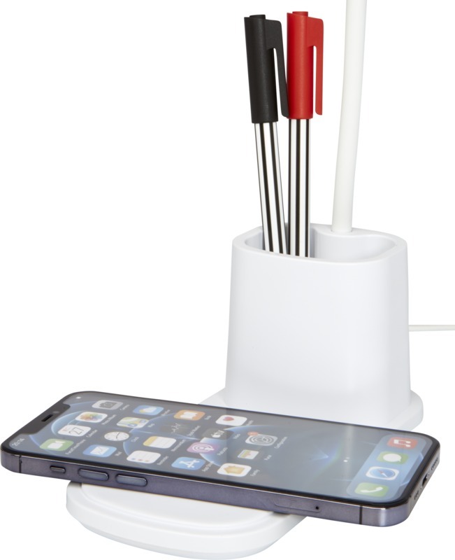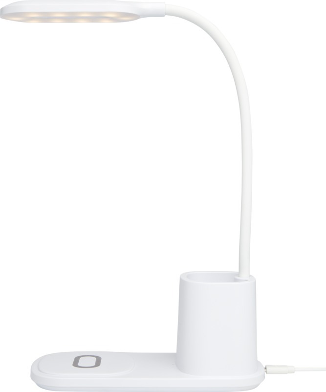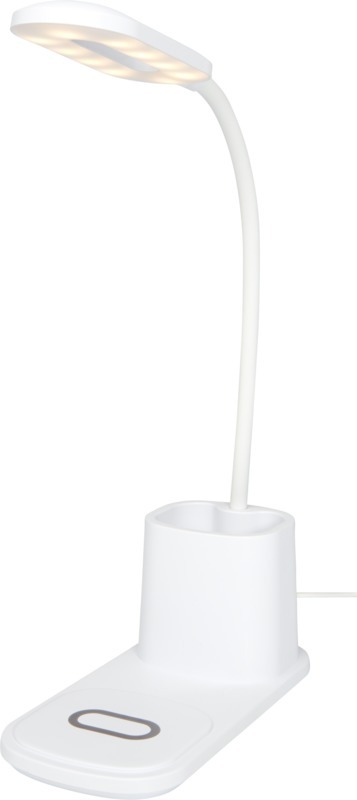 Настольная лампа со встроенным беспроводным зарядным устройством и держателем для карандашей. Лампа имеет 3 настройки освещения (теплое/холодное/среднее) и регулируется по высоте. Выходная мощность беспроводного зарядного устройства составляет 10 Вт, оно совместимо со всеми устройствами Qi (iPhone 8 и выше и устройствами Android, поддерживающими беспроводную зарядку). Пластик ABS.