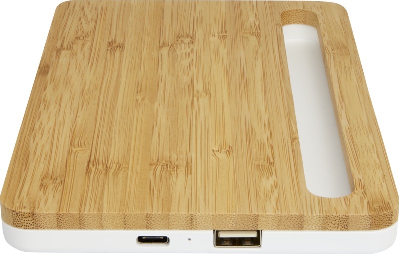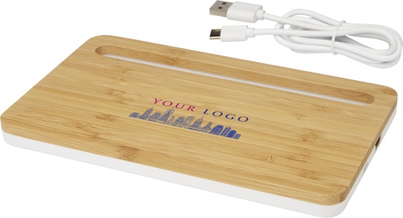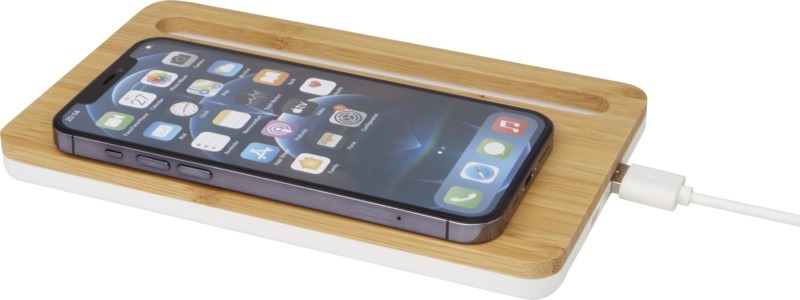Беспроводное зарядное устройство из бамбука со встроенным держателем для телефона, совместимое со всеми устройствами Qi (iPhone 8 и выше и устройствами Android, поддерживающими беспроводную зарядку). Поставляется в подарочной коробке и с инструкцией по эксплуатации (изготовленных из экологичных материалов). Пластик ABS, Бамбуковое дерево. Упаковка: FSC Recycled 100% P5.1 CU-COC-877277.