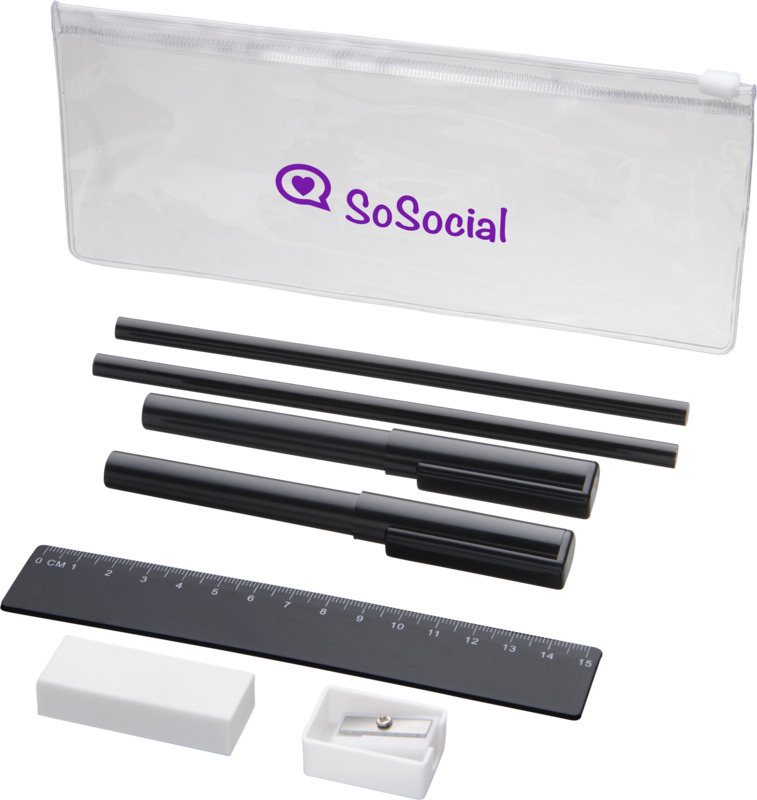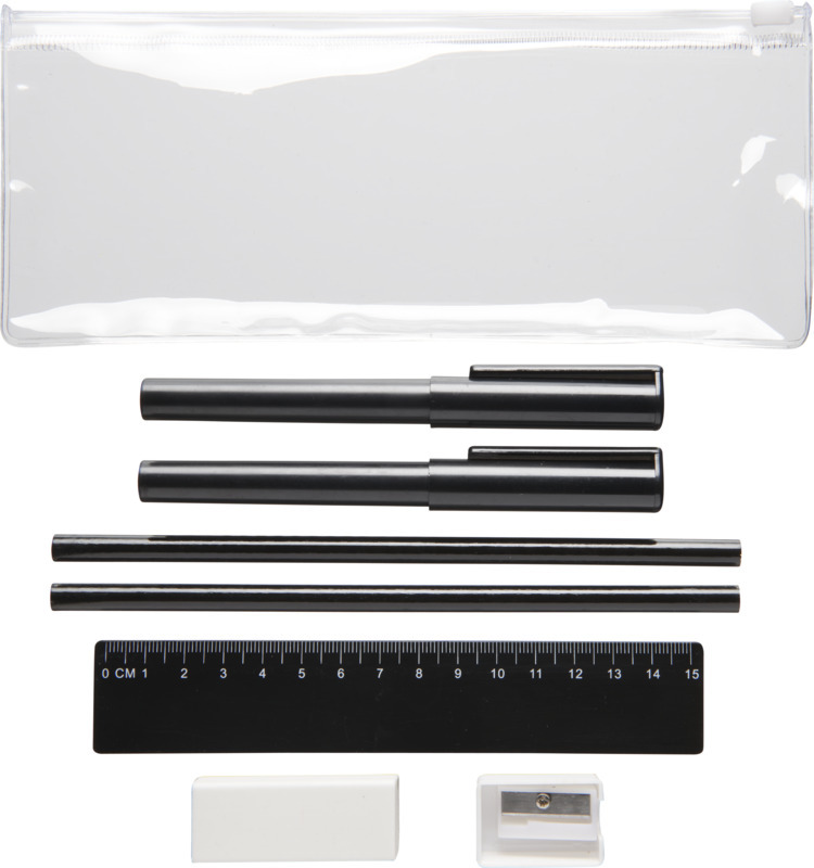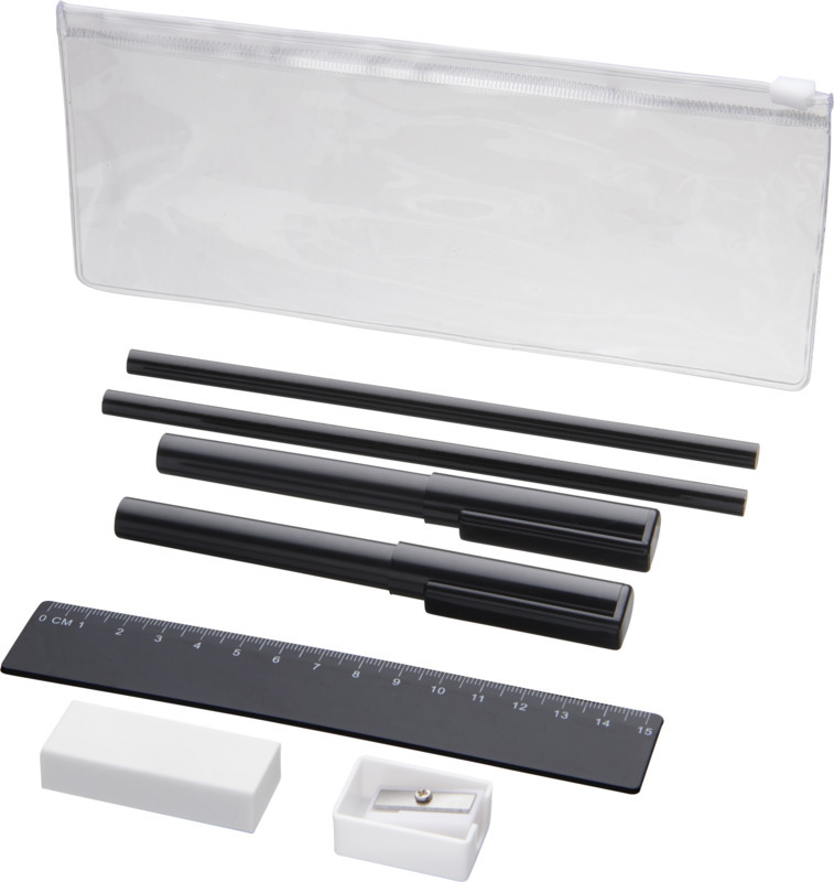 Пенал из ПВХ с 2 шариковыми ручками (1 с черными чернилами, другая с синими), 2 карандаша, линейка, точилка и ластик. Пластик ABS, Пластик AS, Пластик PS.