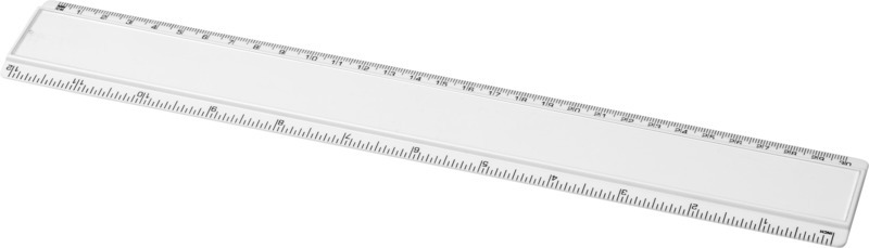 Линейка из пластмассы со вставкой из бумаги, где есть разметка и в сантиметрах, и в дюймах. GPPS Plastic, Бумага. FSC Mix Credit P8 CU-COC-877277.