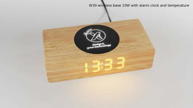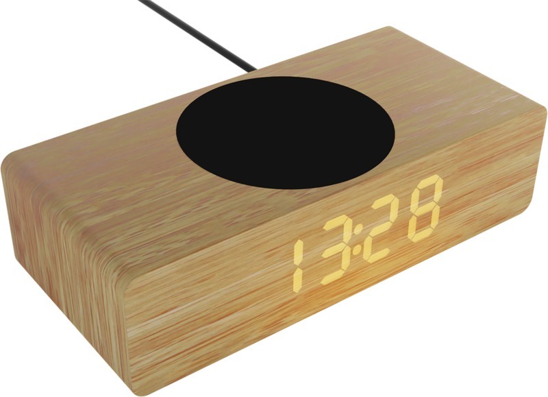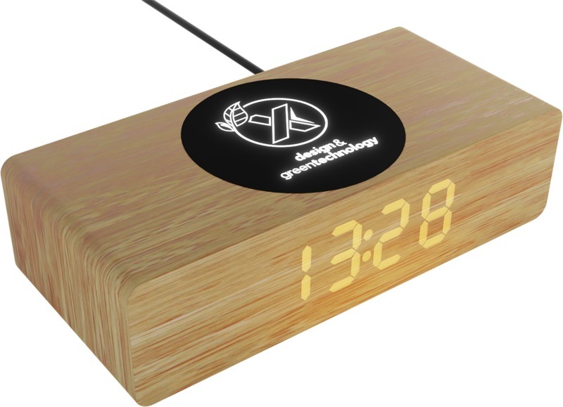 Беспроводная деревянная зарядная станция мощностью 10 Вт с индикатором времени и температуры и светящимся логотипом. Резиновая отделка с антибактериальной обработкой. USB-кабель из переработанного ПЭТ-пластика. Пластик ABS, Дерево.