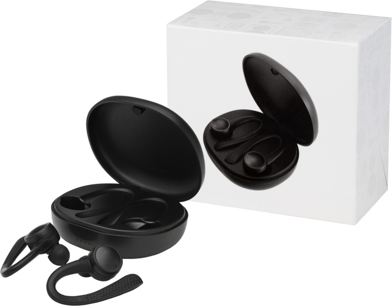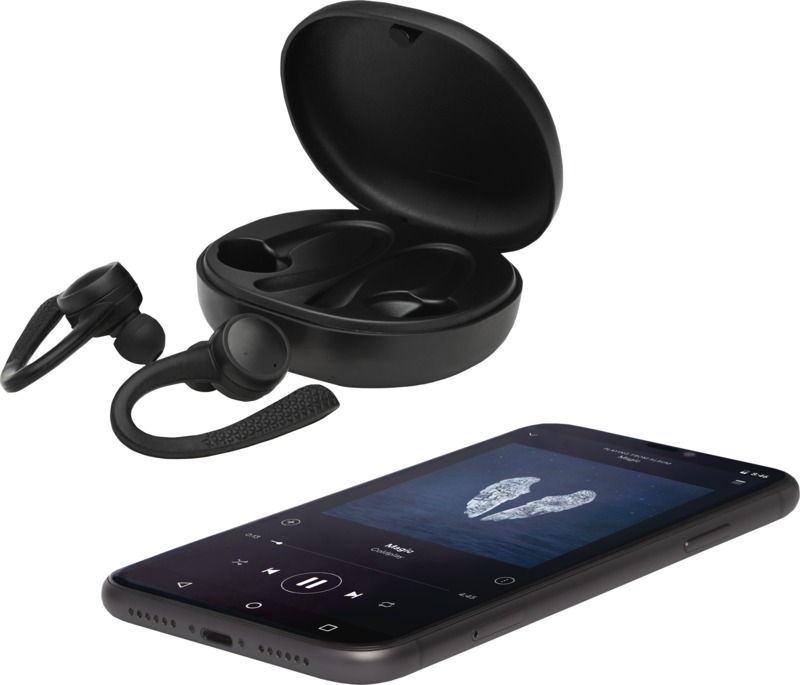Наушники с сертификатом IPX 5 и встроенной кнопкой управления в обоих наушниках. До 6 часов музыки при максимальной громкости на одной зарядке. Время зарядки составляет приблизительно 1,5 часа. В комплект входит 3 адаптера. Bluetooth 5.0. Поставляется в премиальной подарочной коробке. Пластик ABS.